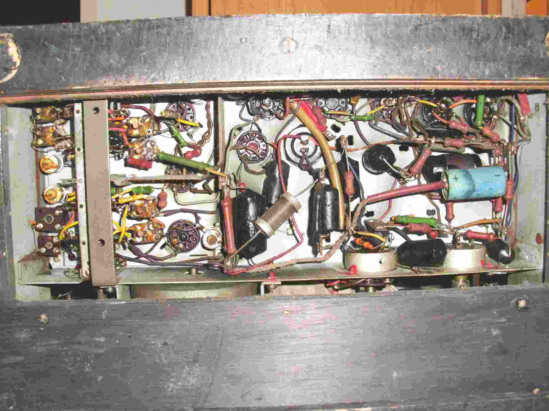 Dies ist ein Philips BCH 581 A. Der hat allerdings die Röhrenbestückung ECH21, 2 X EAF41, EM4, EBL21, AZ1. Die Empfangsleistung ist sehr ansprechend für ein Tischgerät dieser Art - es hat 4 Kurzwellenbereiche, Mittel- und Langwelle. Die Skala ist aus Kunststoff, nicht Glas. Eine Restauration des spanischen Geräts ist sicher lohnenswert, wenn auch das Gehäuse dort wohl nicht ganz so aufwändig (Intarsieren im BCH 581 A) gemacht ist. Dafür ist eine Gegentakt-Endstufe mit 2 x EL41 anstelle der EBL21 drin....
