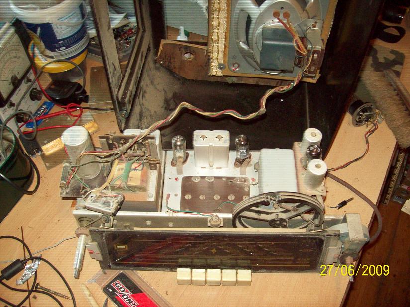 Gehäuse: OK, hat aber Farbspritzer. Das krieg ich hin. Rückwand: sehr gut erhalten. Dreck und Staub: jede Menge ... Betrieb: erst heizt er, dann brummts ... der Gleichrichter ist vermutlich hinüber. Front-Stoff: guter Zustand.