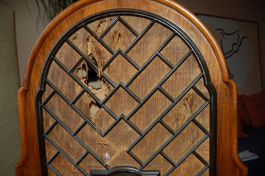 Der verschlissene originale Stoff, sowie die fehlenden Streben sind erhebliche Mängel, die nicht so einfach zu ersetzen sind. Das Gitter ist ungünstig zerbrochen, weil L-förmig umgedreht kommt noch so ein weiterer kleinerer 90° Bogen raus. Vom Gitter prinzipiell muss ein Abdruck gemacht werden, nachgegossen und das Teil dann eingepasst werden. Das ist Spezialistenarbeit für Leute mit viel Erfahrung! Stellt Euch vor die Harzfarbe stimmt nicht ganz, oder die Übergänge müssen tropfenweise nachgeharzt und verschliffen werden? Was dann? Das ganze Gitter überlackieren? Ist ne Möglichkeit, aber dann ist es eben nicht mehr original. Am besten was für Sammler die schon einen haben, dessen Gehäuse aber voll zerfressen oder aus dem Leim und Teile verloren sind. Zum Stoff: Ich habe 50er Jahre original Vorhangstoff da, der durchaus passabel an dem Gerät aussehen würde, aber es wäre dann doch nicht ganz das originale Muster und Beschaffenheit. Eben nicht mehr original. Ausserdem fehlt an der Seite das Hebelchen vom Schalter und von der runden Blende ist auch was abgebrochen. Wahrscheinlich ist auch die Lautsprechermembran defekt so wie es aussieht.
