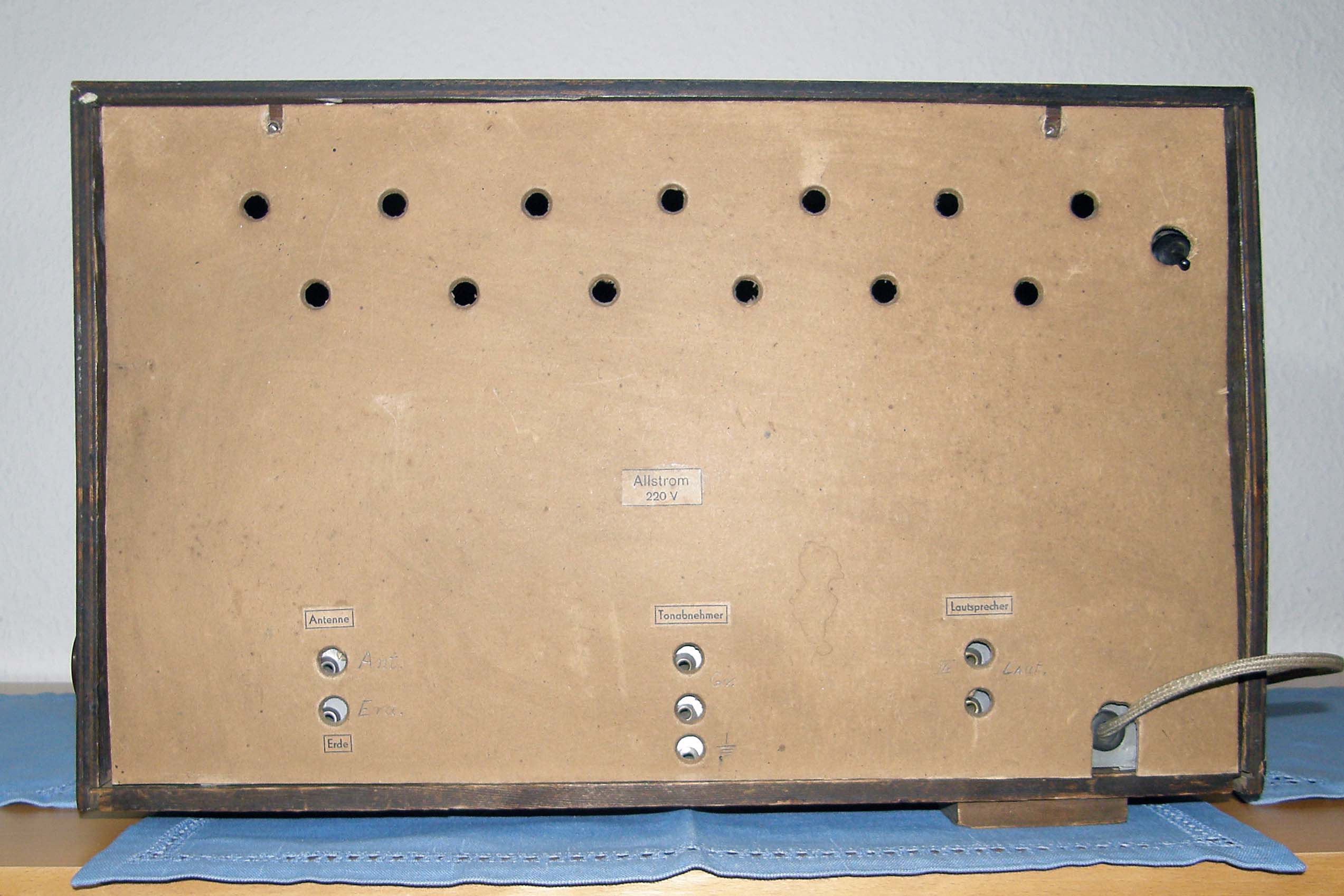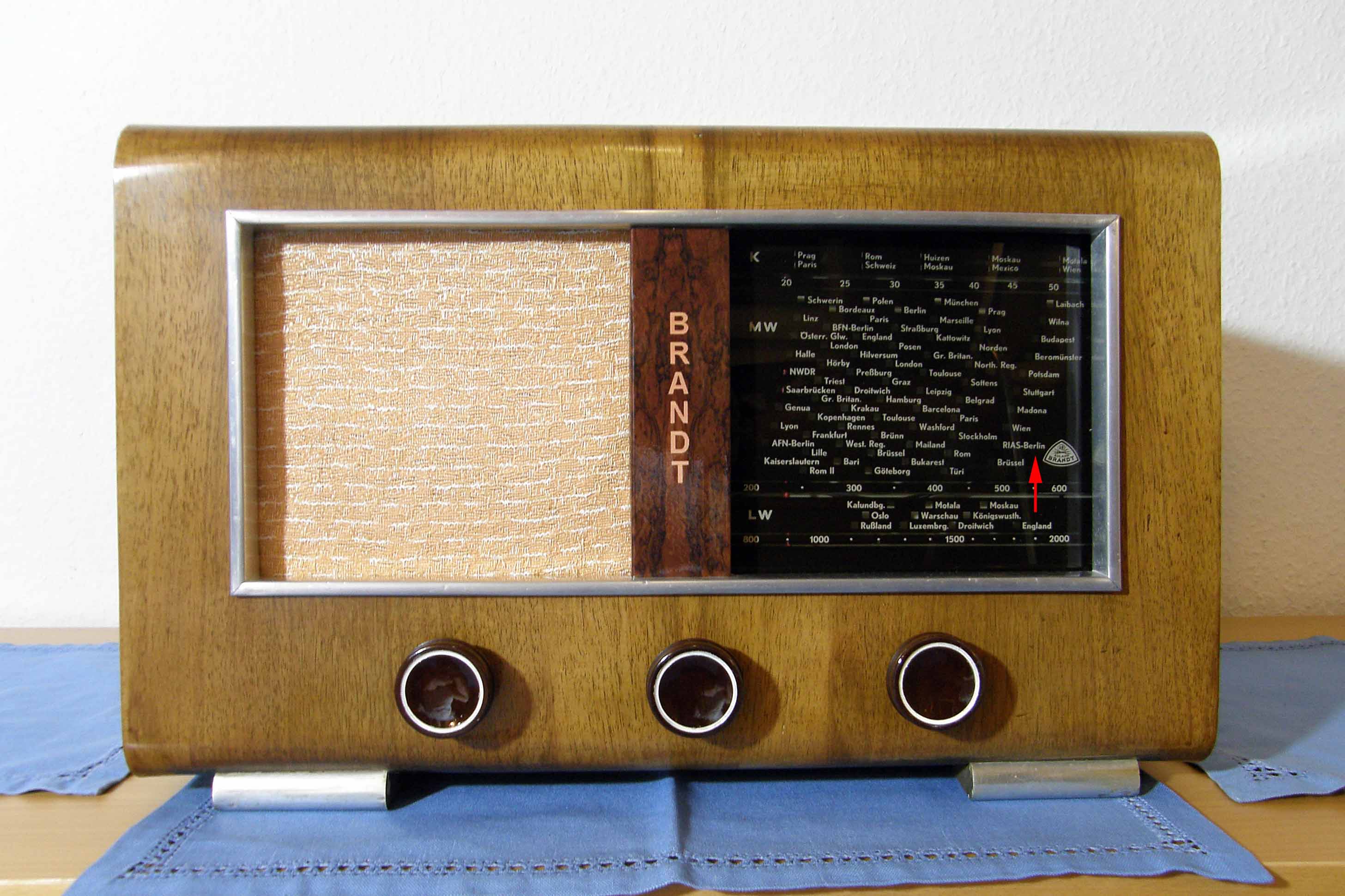 mein Lieblingsradio bekam ich kürzlich von einem guten Freund (dem besten, den man haben kann) für einen Gefallen, den ich ihm tat, geschenkt. Es stammte aus dem Nachlaß seines in den achtziger Jahren verstorbenen Großvaters, der in Berlin-Friedrichshain in der Kopernikusstraße ein privates Radiogeschäft (Radio-Krusch) betrieb. Man konnte dort Radios usw. kaufen aber das Hauptgeschäft war die Reparatur von Radiogeräten und das Aufladen der Anodenbatterien, die man in den fünfziger und auch noch teilweise in den sechziger Jahren für die Kofferradios brauchte. Er führte dieses - und das war eigentlich die Ausnahme - nicht verstaatlichte Geschäft bis in die siebziger Jahre. Ich vermute ganz stark, dass es sich bei diesem Radio um einen Eigenbau mit Teilen der Fa. Roland Brandt Berlin handelt. Die Ausführung des Chassis, die ausgesägten Löcher an den Alu-Abschirmungen und die einfach gestaltete Rückwand lassen mich das vermuten. Eine andere Variante wäre, dass es sich um ein Meister- bzw. Gesellenstück, das von dem o.g. in den vierziger Jahren bei der Fa. Brandt gebaut wurde, handelt. Allerdings weiß ich nicht, ob so etwas üblich war. Der Steg in der Mitte zwischen dem Lautsprecher und der Senderskala ist keineswegs, wie man vermuten könnte, aus Holz. Es handelt sich um ein U-förmig gebogenes Blech, das mit einer Art Aufkleber in Wurzelholzoptik versehen war. Leider ist das Original dieses Aufklebers zerbröselt (es fühlte sich wie altes Filmmaterial an) und ich musste es durch einen Ausdruck meines Druckers ersetzen. Es gleicht keinem der Radios der Fa. Brandt, die ich im Internet gesehen habe. Ich vermute, dass es kurz nach dem 2. WK hergestellt wurde, denn es ähnelt von der Ausführung her den Vorkriegsmodellen der Fa. hat aber schon die Senderskala auf der RIAS-Berlin (roter Pfeil auf dem Foto) steht, und dieser Sender (Rundfunk im amerikanischen Sektor) wurde erst 1946 gegründet. Es würde mich freuen, wenn diese kleine Abhandlung jemanden interessiert hätte und wenn ich ein paar Meinungen dazu hören könnte.