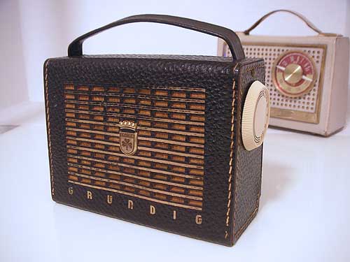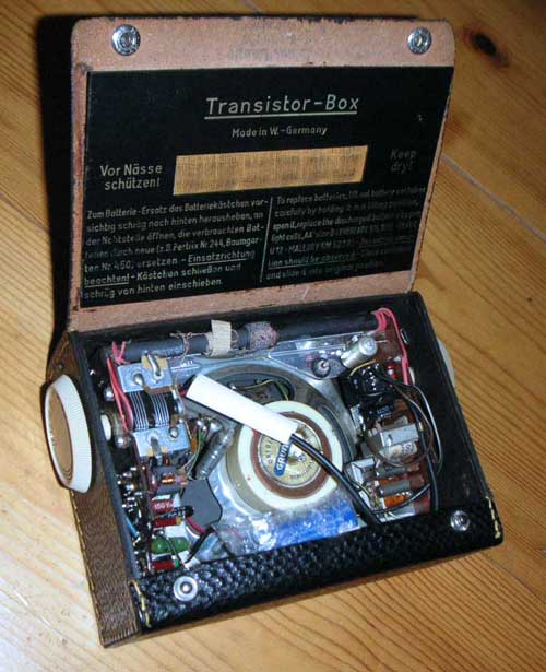 Was ist das besondere daran? Neben der sparsamen, optimierten Schaltung die Lederhülle mit den Druckknöpfen! Im Bildhintergrund oben ist das Modell Music-Transistor-Boy zu sehen. Ich habe die Transistor-Box defekt aus der Bucht gefischt und - Gott sei Dank - waren alle Transistoren noch intakt und original. Jetzt empfängt und spielt sie wieder recht ordentlich, solange die Mittelwelle noch Sender hat...