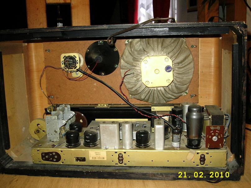 Ein schönes Radio in einem guten Zustand, was man als Glücksfall bezeichnen kann. Da sind noch die guten alten Stahlröhren drin. Die Verzerrungen können von Koppel-C`s oder aber auch von einem defekten Elko der Kothodenkombination herrühren. Das zu finden, wird für Martin M. sicher kein Problem sein. Ich würde mich ohne Neid auch über so ein gutes Stück freuen. Der Sammlerwert spielte da für mich die untergeordnete Rolle.