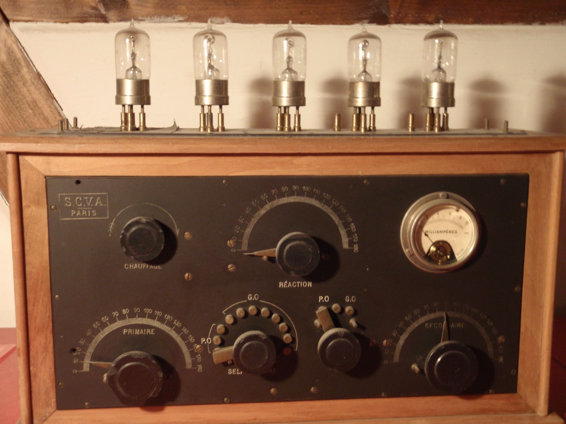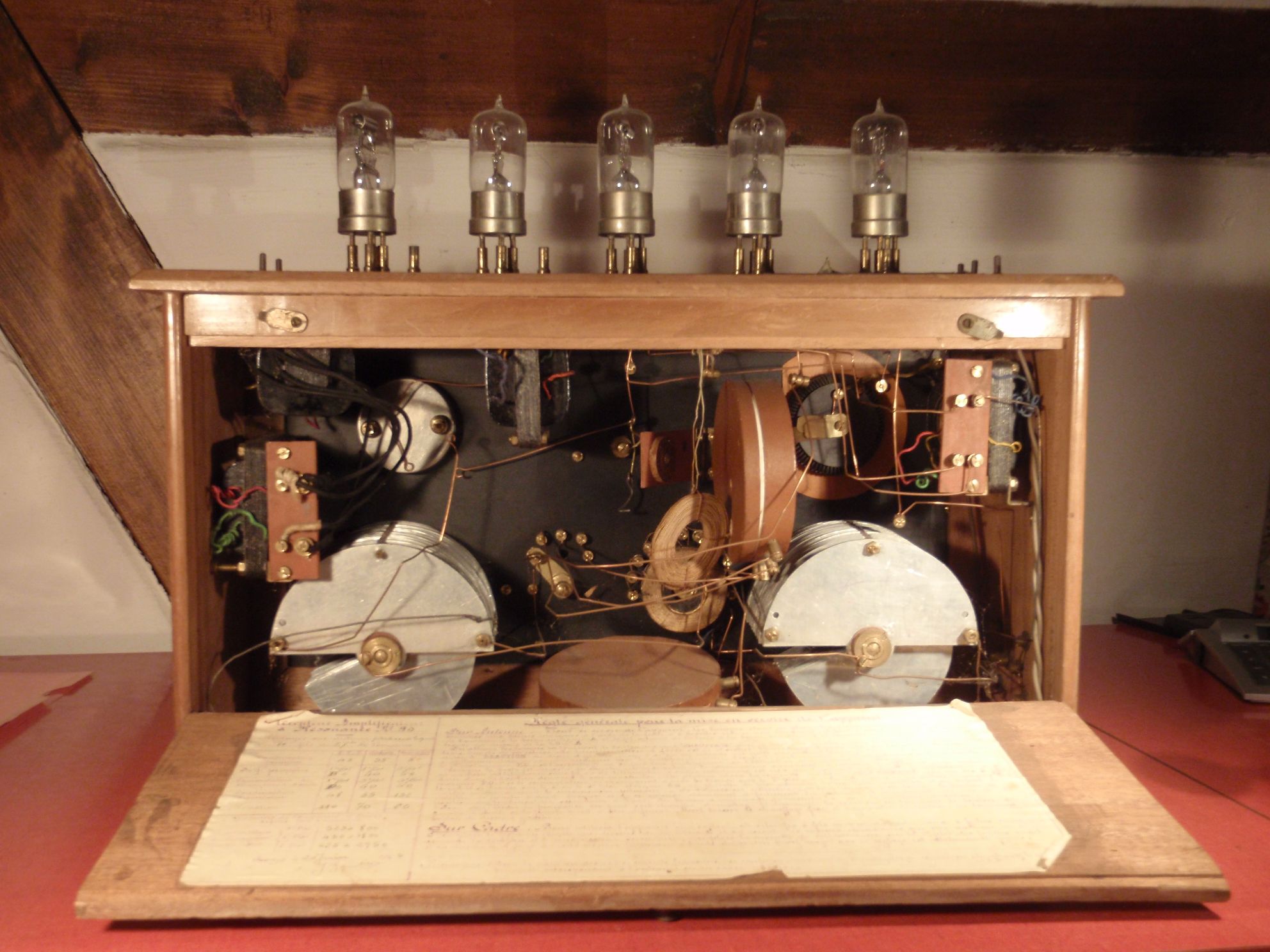 Hallo Jürgen, hab grad mit dem Besitzer dieses Teils, meinem Vater gesprochen, über 80 aber voll mit Röhren Radios vertraut. Er möchte von Dir wissen was genau die 5 Röhren bewirken und ob Dir die Einträge auf dem Blatt (neuer Anhang) etwas bedeuten und ob Dir S.C.V.A Paris bekannt sind . Schön das Du geantwortet hast, hoffe wir kriegen das Teil zum Laufen