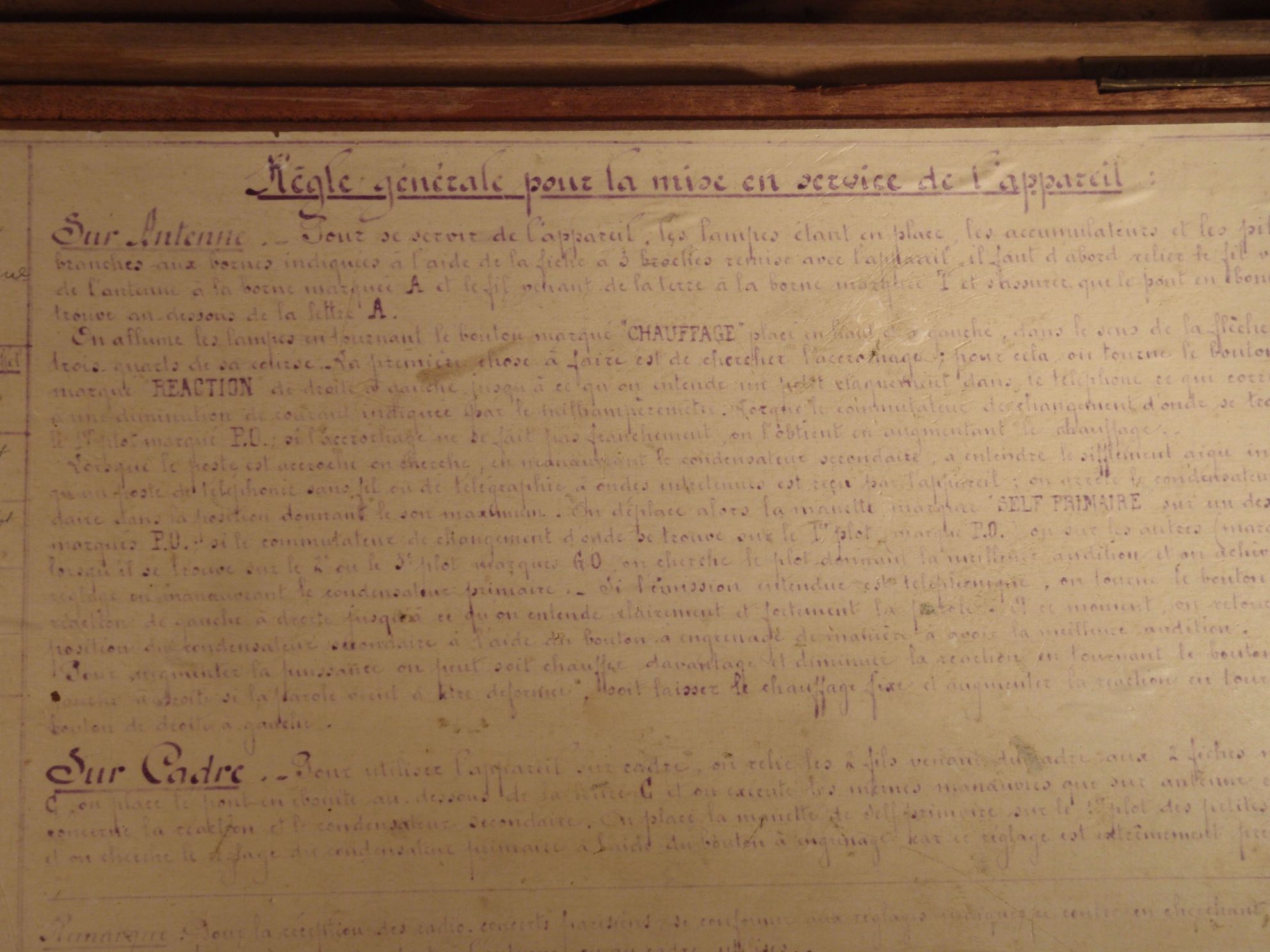 Da hast Du ein sehr schönes und antikes Gerät zur Wiederbelebung erhalten. Deine Dokumente sind aus dem möglich Lesbaren wohl französischer oder belgischer Herkunft. Leider ist der Röhrentyp nicht erkennbar. Sicher handelt es sich dabei um Trioden und einen vermutlichen Zweikreis-Geradeausempfänger. Da lässt sich, wie Jürgen sagt, die Schaltung noch relativ leicht nachempfineb bzw. aufzeichnen. Viel Spass und Erfolg mit dem kostbaren Oldtimer.