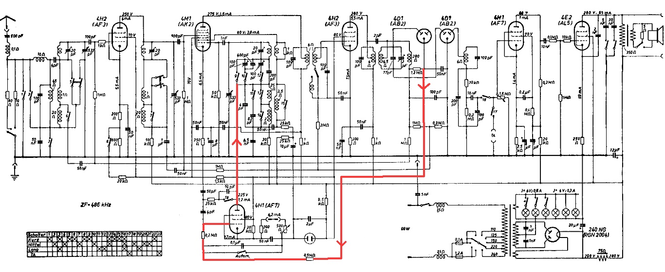 Die negative / positve Richtspannung wird mit den beiden Diodenröhren (AB2) am letzten Mittenbasis-ZF-Schwingkreis gewonnen und der Röhrenstufe AF7 an der Mischoszillatorstufe zugeführt. Diese Röhre arbeitet als variabler Kondensator oder Reaktanzstufe (muss mir das noch genauer ansehen ...) und steuert die Oszillatorfrequenz nach oben oder unten bis Pegelmaximum.