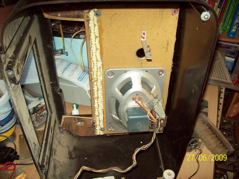 Gehäuse: OK, hat aber Farbspritzer. Das krieg ich hin. Rückwand: sehr gut erhalten. Dreck und Staub: jede Menge ... Betrieb: erst heizt er, dann brummts ... der Gleichrichter ist vermutlich hinüber. Front-Stoff: guter Zustand.