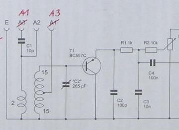 "Der PNP- Transistor T1 arbeitet als Emitterfolger . C2 und die Basis-Emitter-Kapazität von ca. 5pF bilden einen kapazitiven Spannungsteiler. Zusammen mit dem Schwingkreis wird ein