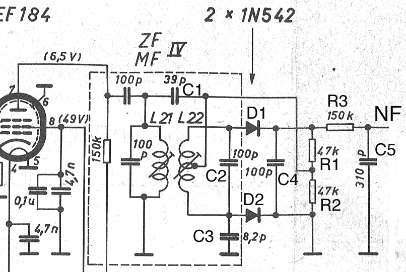 zum symmetrischen Ratio-Detektor: gemeint ist, dass an Stelle von C21 ein Elko von R18 nach Masse (Minus an R18) und ein zweiter von R19 nach Masse (Minus an Masse) geschaltet wird, also je einer parallel zu R21 und R22. So wird der NF-Ausgang symmetrisch zur Masse und damit AFC-tauglich. Mit der EABC80 geht das aber nicht, da die Kathoden beider Dioden 'schweben' und nicht auf Masse liegen.