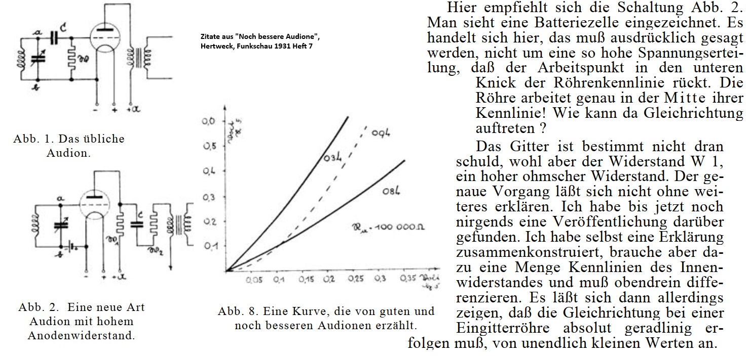 Oh weh, nicht mal der erste Beitrag ist dem Gemetzel entronnen. [edit 2024-04-15] Hallo, In der Funkschau 1931/07 ist ein interessanter Artikel zu finden: "Noch bessere Audione" von Carl Hertweck, der viele Artikel verfasst hat.