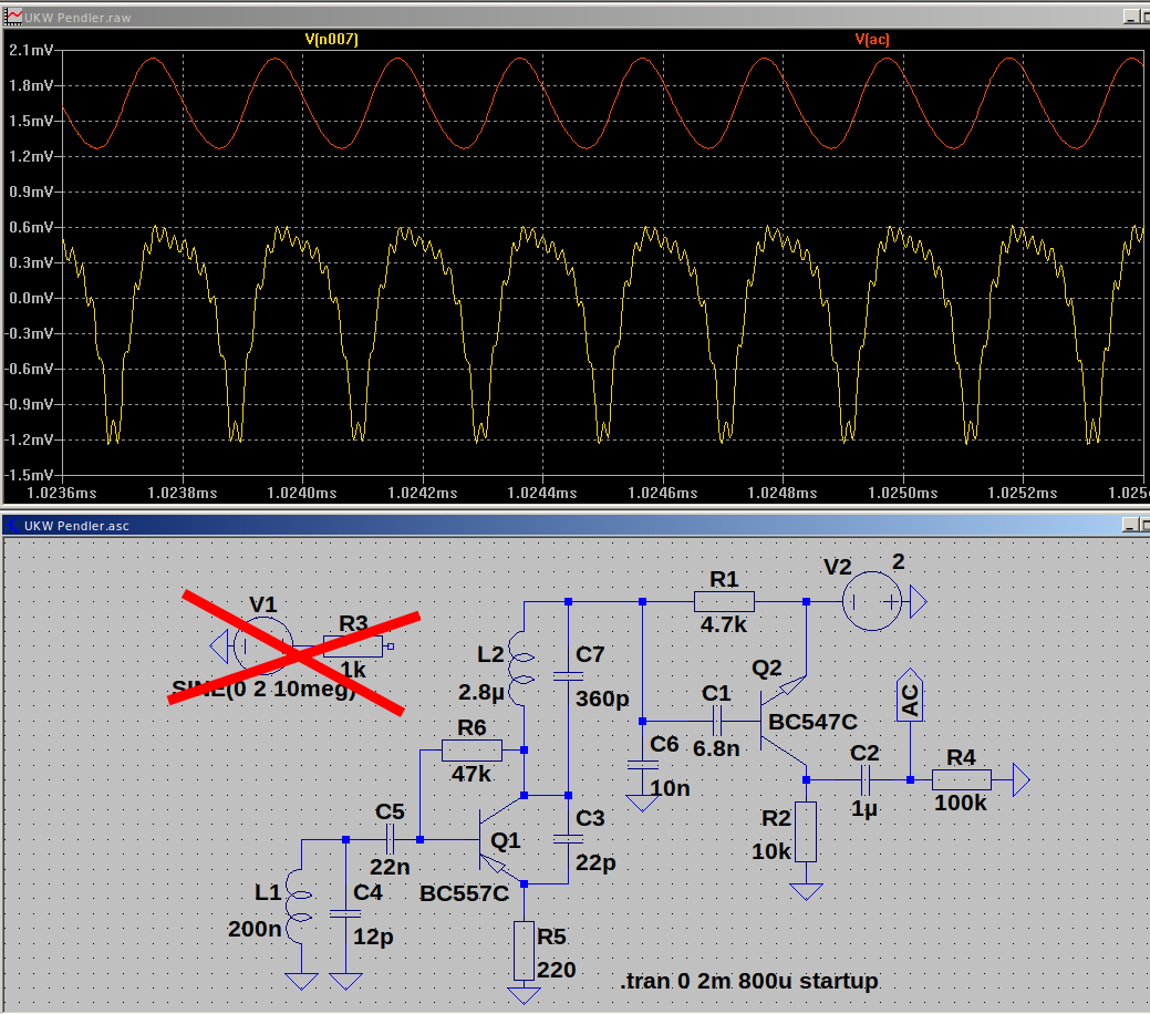Also da wird eine NF an L1 gelegt mit einer Frequenz von 1kHz (1ms). Der Q1 arbeitet nur als NF Verstärker und gibt über C1 das Signal weiter an Q2 was verstärkt am Collector anliegt.