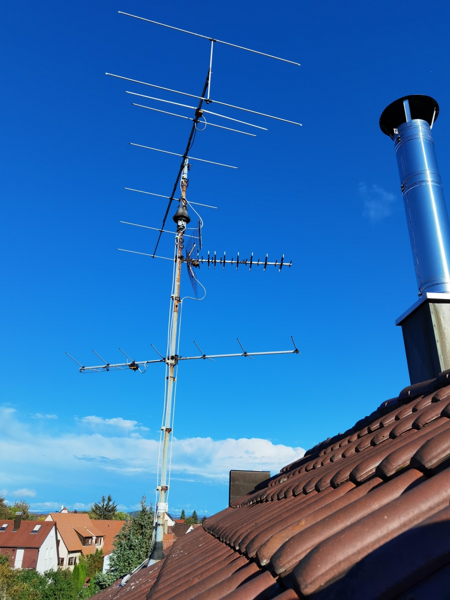 Mit Antennen hatte ich schon als Bub zu tun. Nachdem ich einen alten Fernseher geschenkt bekam, mußte auch eine passende Antenne her. Das ist nun genau 40 Jahre her. Besonders die große Kathrein Olympia hat es mir angetan, liebevoll Gitterantenne genannt. Das Kabelfernsehen wurde grade eingeführt, am Sperrmülltag war dann genug zu finden. Mit meinem Freund bin ich losgezogen. Mit vollgepackten Fahrrädern vor der Eisdiele kauften wir uns noch ein Eis. Das war ein Blickfang. Bei uns im Haus ist die Antenne am Dachboden, parallel dazu installierte ich dann meine Gebrauchtantenne. Später dann umgebaut auf DVB-T, nach Umstellung auf DVB-T2 stillgelegt aber nie ausgebaut. Später kaufte ich dann eine Nagelneue Olympia AOS, das ist die Zweitgrößte aus dieser Serie. Die kleinste hieß AOI, entsprechend größer, AON, AOP, AOS, AOT. Die VHF Typen waren: Multika AV 06, 09, 11, 12, oder die Monoka das waren VHF Antennen genau auf einen Kanal abgestimmt mit gestrecktem Dipol. Eine Fuba ist auch dabei den Typ kenne ich leider nicht, ich nannte sie immer Wäscheklammernantenne. Noch ein Bild von meinem Nachbargebäude mit noch vorhandener Hausantenne von oben: Olympia AOS, 2x Multika AV06 und eine UHF AU06, im Vordergrund ist noch eine Antenne für den BOS Funk, gehört zur Sirene und für den Betriebsfunk der Gemeinde. Gruß Jochen