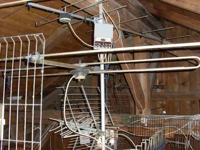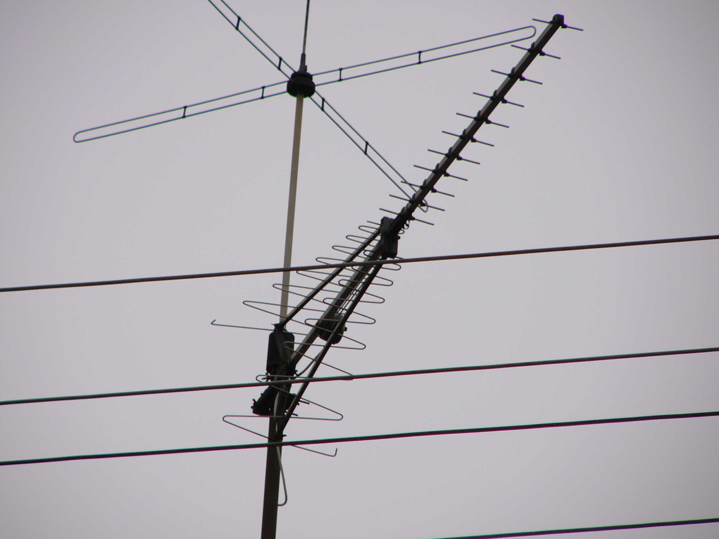 Oben VHF Richtung HD, da wurde gerichtet nach Osten vertikal ARD ausgestrahlt. Ebenfalls auf UHF. Warum man dann noch ne Antenne montiert hat? Unten ggf. Fuba?, Richtung HD.