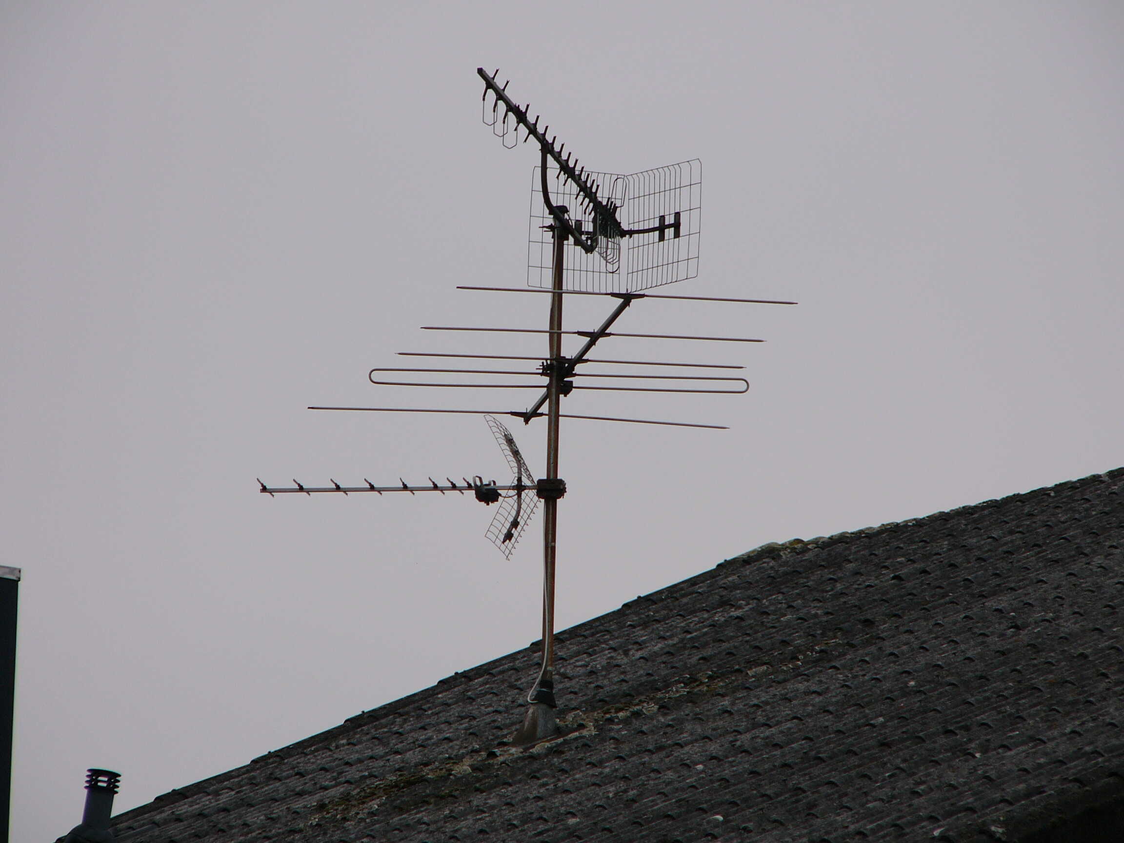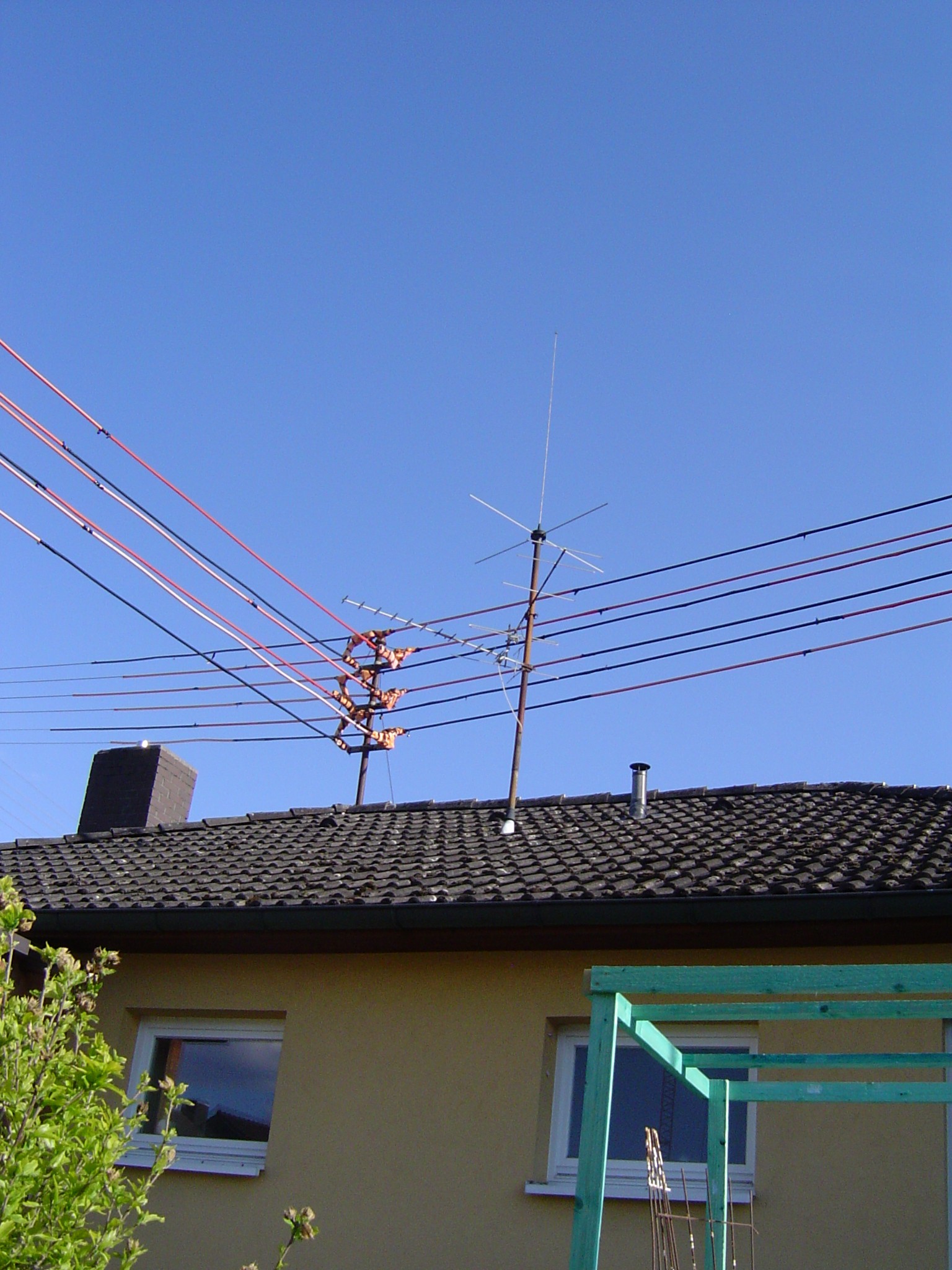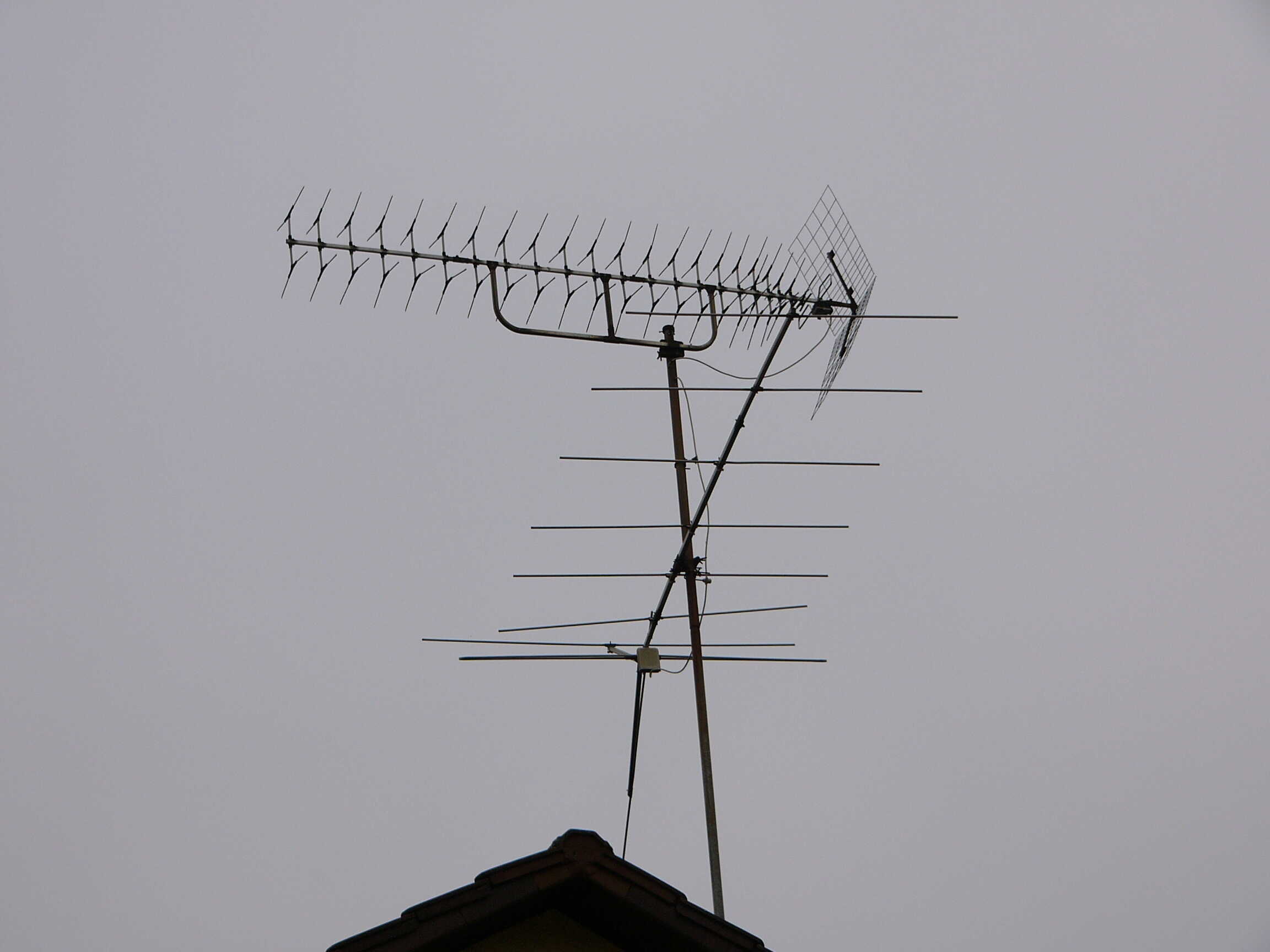 Hier kenne ich leider keine Modellbezeichnungen. Muss aber so Ende 60er/Anfang 70er entstanden sein. Auf Fotos Ende der 70er war diese Antenne schon so vorhanden. Der Reflektor der UHF-Yagi ist schon halb weggegammelt.