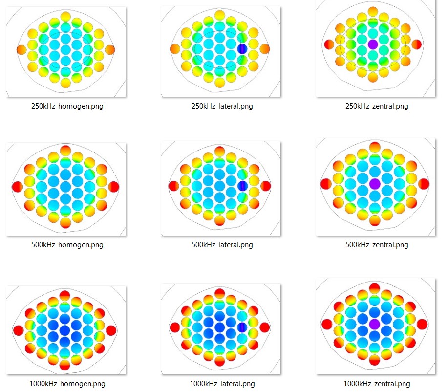 Homogen bedeutet, alle Drähtchen sind angeschlossen, lateral bedeutet, dass eines der Drähtchen im rechten Mittelfeld an einem Ende lose ist und zentral, wenn das zentrale Drähtchen lose ist. Alles für drei verschiedene Frequenzen. Wie man sieht, der Skin-Effekt wirkt über die Drahtgrenzen hinaus, sodass die inneren Drähtchen bei wachsender Frequenz mehr und mehr an Bedeutung verlieren, also bei einer HF-Litze sind eigentlich mehr die äußeren Drähte stromführend.