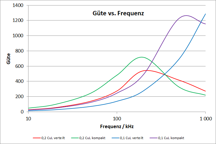 ich habe nochmals den Zusammenhang zwischen Drahtdicke, Wickelart und Frequenz bezüglich zu erwartender Spulenspannung und Güte simuliert.