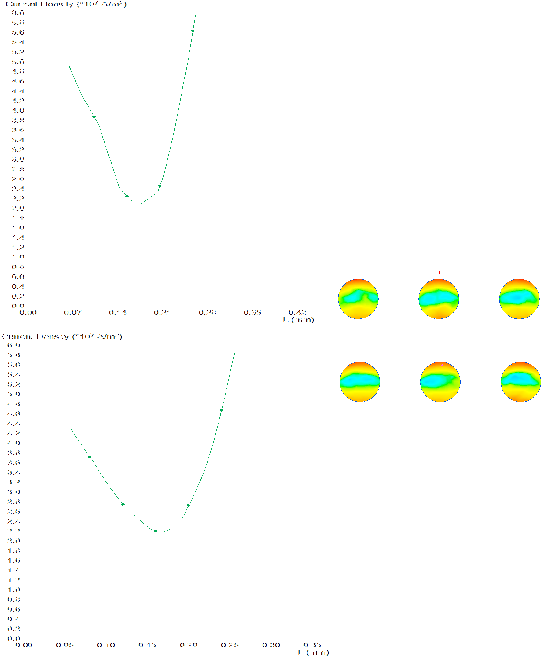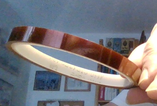 Die Ursache ist die Stromverdrängung durch Streufelder des Kerns. Ich behaupte, bei diesen niedrigen Frequenzen ist das vernachlässigbar. Die Simulation zeigt: Oben ist der Abstand des Drahtes gering (man sieht die Linie, ab wo der Kern beginnt), unten ist der Abstand weiter. Im Verlauf der Stromdichte quer durch den Draht sieht man den Unterschied. Aber: Das wird hier erst deutlich, weil eine Frequenz von 1 MHz gewählt wurde. Welcher Abstand -- das hängt natürlich auch von der Drahtstärke ab. Man kann ja sicherheitshalber zwei Schichten Isoband verwenden. Ich persönlich benutze dieses Band hier (ist speziell für Trafos oder Spulen): Für 0,1 oder 0,2 mm CuL ist das sicher ausreichend, wenn Du Frequenzen <20 kHz fährst.