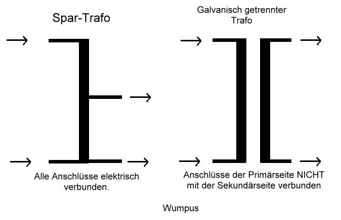 Ohohoh - Vorsicht! Diese Adaptertrafos sind in der Regel - wie oben schon beschrieben - keine Trenntrafos sondern Spartrafos! Bei denen liegt das Netzpotential auch an der Ausgangsseite! Mit einem einfachen Ohmmeter lässt sich dies feststellen: Wird es zwischen Eingang und Ausgang verbunden und schlägt im niedrigen Ohm-Bereich quasi voll aus handelt es sich um einen solchen Spartrafo.