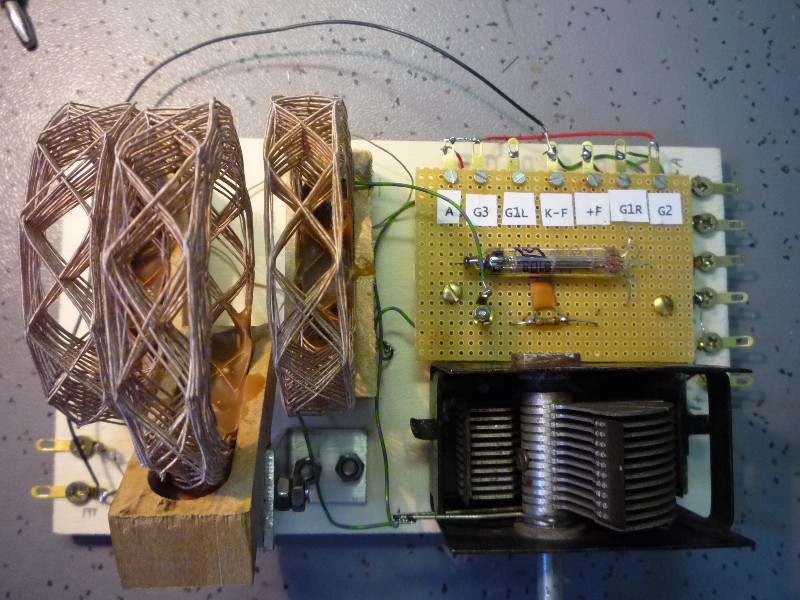 Hallo Dietmar, die 2 Spulen sind gleichsinnig und addieren sich in der Wirkumg. Ich habe das natürlich mit einem sensiblen LC Messgerät geprüft. Beide zusammen ergeben in dieser physikal. Anordnung exakt gemessene190 uH. Den Wert konnte man durchaus durch Veränderung des räumlichen Abstandes von einander von gemessenen 180 bis 246 uH verändern . Bei dieser Geschichte kommt es wohl mehr auf den exakten Mittelpunkt an. Die zwei Spulenlösung wurde gewählt, weil das Festlegen der Mittelanzapfung etwas schwierig mit Jürgen´s Wickelautomat zu bewerkstelligen war. Es ging mir eigentlich nur darum, diese Schaltung mit zwei gleichrangigen Steuergitter auszuprobieren. Da ich keine Wunderlichröhre besitze und die einzige so ausgestattete Rö die ich kenne und besitze eine russ. 1sh37b ist, habe ich es damit versucht. Normalerweise ist das eine Mischröhre. Liebe Grüsse Franz