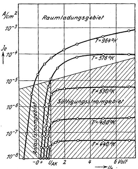Eine gute kleine Grafik gefunden, die den Zusammenhang zwischen Katodentemperatur einer Oxydkatode und deren Emission zeigt. Bei unterheizter Katode wird der Raum für das nutzbare Raumladegebiet immer kleiner oder es wird gar nicht erst erreicht. Es handelt sich bei der Grafik um eine Darstellung physikalischer Grundsätze.