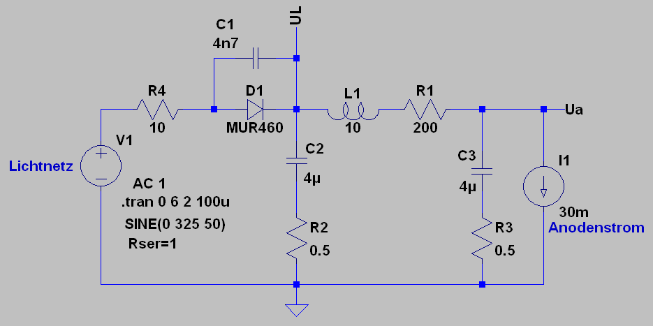 Auch die Höhe des Anodenstroms von 30mA ist geschätzt. Da er nicht linear von der Anodenspannung abhängt, habe ich ihn hier einfach mal als konstant angesetzt. Die Restwelligkeit ist natürlich auch von diesem Wert abhängig.