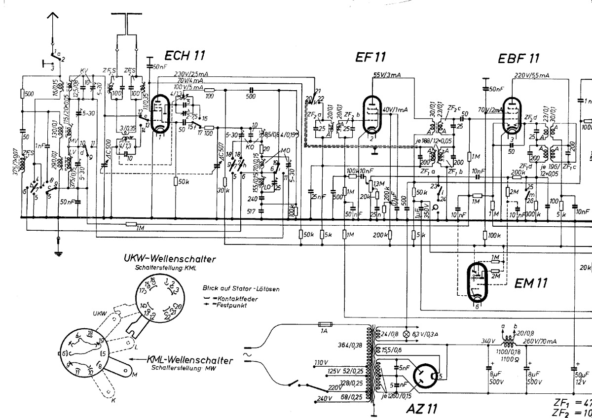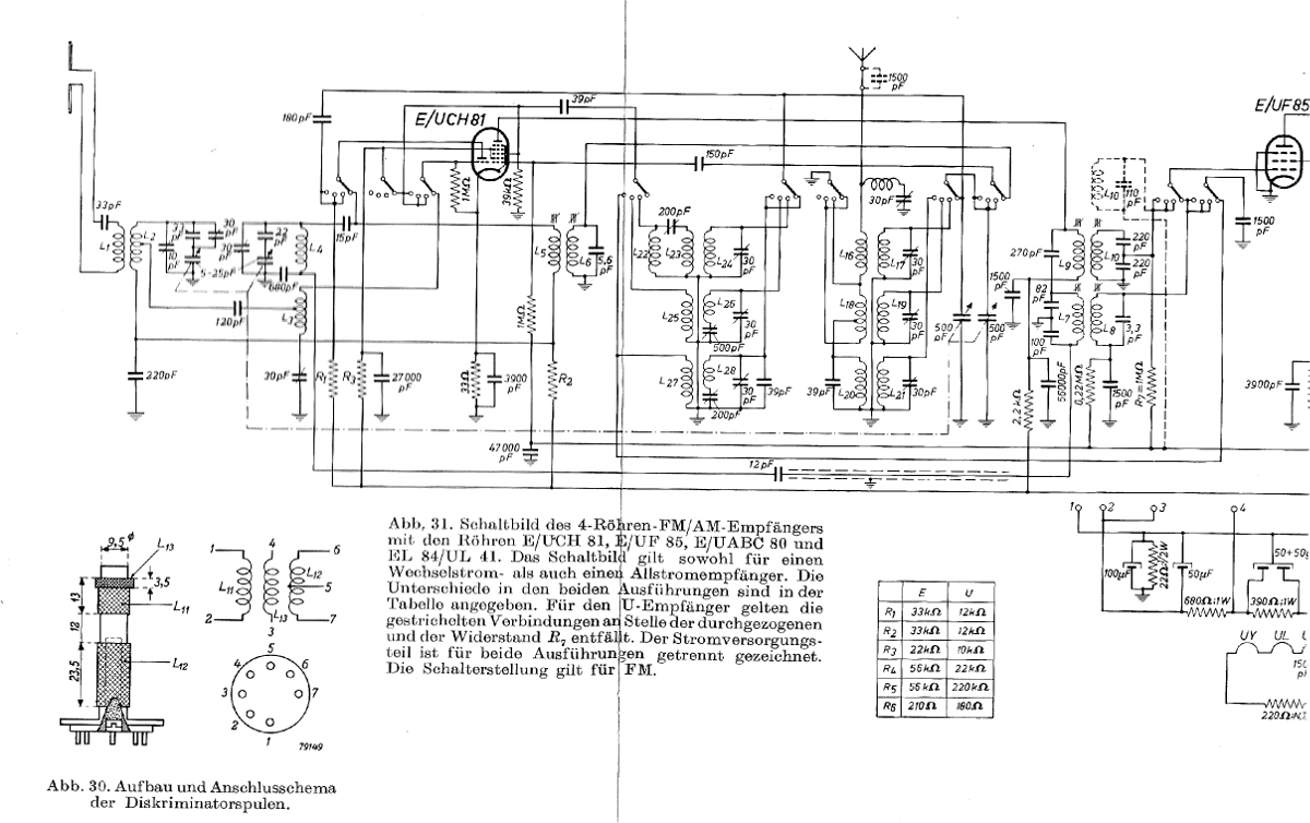 Ich finde es interessant, wie viele "kreative" UKW-Schaltungen erfunden wurden, obwohl sie eigentlich fast nichts einsparten. Auch die eingebauten Pendler brachten keine Einsparung bei den Röhren, da man mit diesen Röhren genauso gut eine HF-Vorstufe mit Mischer bauen kann, und der ZF-Teil ist von AM schon vorhanden. Wenn man sparsam sein will, kann man dann gleich mit der AM-Diode Flankendemodulation betreiben. Am ehrlichsten wird noch mit deiner ECH81-Lösung gespart (also die Heptode als ZF-Verstärker), da wird die sonst arbeitslose Triode der ECH81 für UKW wiederverwendet. Da die ECH81 aber erst später erfunden wurde, als UKW längst eingeführt war, wollte wohl kaum einer mehr ein derart minimalistisches Gerät, vor allem wenn man bedenkt, dass es damals noch viel weniger UKW-Sender gab und daher eine gute Empfindlichkeit an vielen Orten notwendig war. Die vielen UKW-Umschaltkontakte machten das Ganze auch mechanisch aufwendig, da die Leitungen sehr kurz sein müssen.