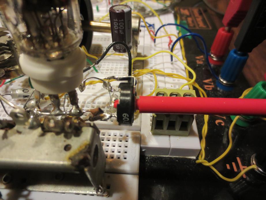 - Bei Versuch 3 hätte wohl die Anodenspannung erhöht werden müssen. Dies war aber nicht möglich, da die nächste Schaltstufe des Selbstbaunetzteils dann 120VDC generiert hätte. Die EF98 ist für solche Spannungen nicht ausgelegt.
