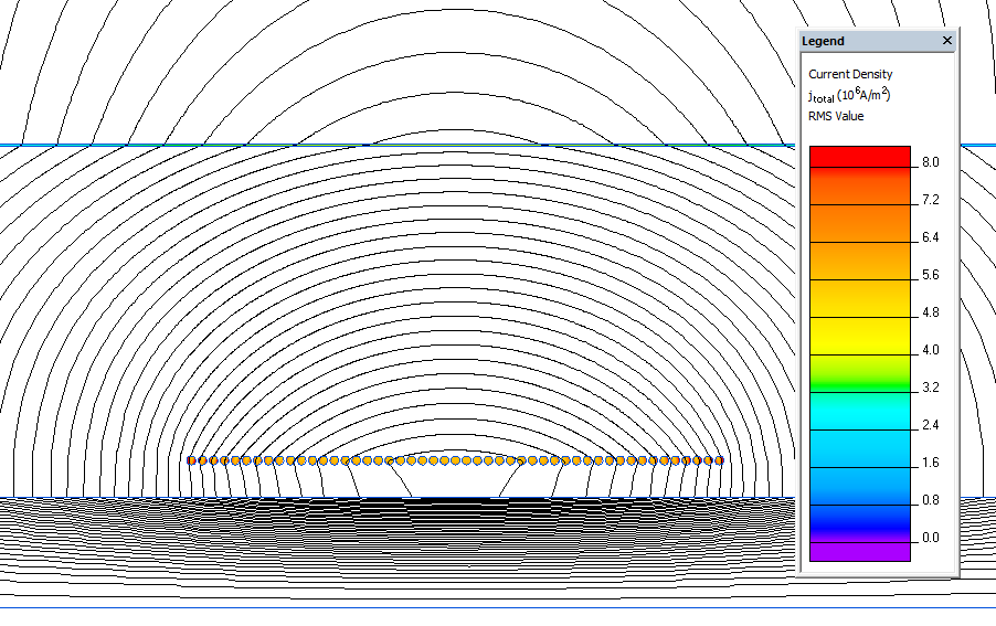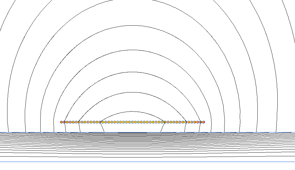 Ohne Schirmung sind die Feldlinien noch unbeeinflusst. Imm unteren Teil des Bildes befindet sich der Ferritstab als halber Querschnitt in der Rotationssymmetrie. Etwas entfernt davon sieht man ebenfalls im Querschnitt die 49 Windungen der Spule.