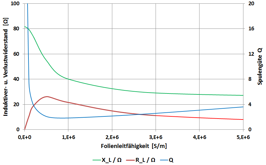 Bei der Steigerung der Leitfähigkeit ist übrigens noch bemerkenswert, dass zunächst der Verlustwiderstand steigt, um dann wieder abzufallen. Genauso verhält es sich mit dem Leistungsumsatz innerhalb der Schirmfolie (wenn man Strom durch die Spule schickt). Umgekehrtes gilt für die Spulengüte: Sie erreicht ein Minimum, wenn sozusagen Leistungsanpassung für die Schirmfolie vorliegt, sie steigt bei leitfähigeren Folien jedoch wieder an: