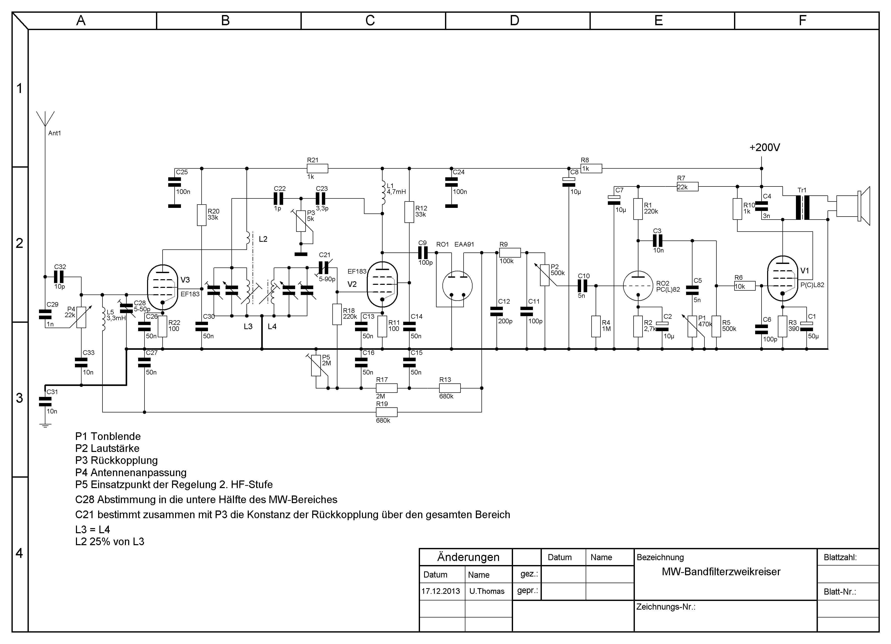 Dass Röhre 1 stärker regelt als Röhre 2, ist Absicht. Ich möchte ja, dass die 2.Stufe nicht schon bei relativ schwachen Sendern anfängt herunterzuregeln. Das würde die Rückkopplung so unwirksam machen, dass der Vorteil , dass beide Schwingkreise durch ebendiese Rückkopplung entdämpft werden, wieder zunichte gemacht würde. Es wäre dann nur noch ein normaler Bandfilterzweikreiser. Der Unterschied ist mehr als deutlich zu merken, wenn man die Rückkopplung auf Null dreht. Bis 800kHz geht das noch, aber darüber steigt die Bandbreite des Filters so an, dass im oberen MW-Bereich die dann dicht an dicht liegenden Sender nicht mehr sauber voneinander zu trennen sind. Vielleicht ist das von mir verwendete Bandfilter nicht ganz optimal (obwohl diese Filter aus Meuselwitz eigentlich nicht schlecht sind). Deshalb soll die 2. Stufe erst bei relativ stark einfallenden Sendern runterregeln. Den Hauptanteil der Regelung erledigt deshalb die 1. Stufe. Schwingneigung der 1. Stufe wird hoffentlich durch die Bedämpfung des Eingangskreises durch die 22kOhm (vielleicht 10kOhm?) in Verbindung mit der relativ losen Ankopplung des Ausgangs an den 1. Kreis des Bandfilters verhindert.