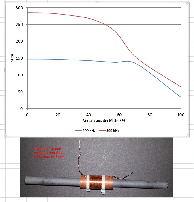basteljero:Die gnannte Kurven erkläre ich mir so: In der Mitte des Stabes übt dieser maximale Wirkung auf die Spule aus, die wirksame Permeabilität ist am größten, aber auch die Verluste des Ferrit-Materials machen sich am stärksten bemerkbar. Schiebt man die Spule aus der Mitte, ergibt sich eine größere "Scherung" des Kernes, und ein Optimum der Spulengüte.