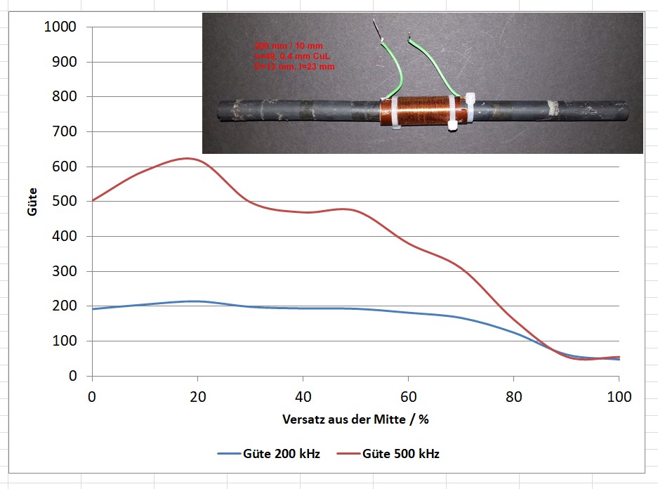 Ja, das ist klar. Aber: Bei genauer Betrachtung des Diagramms sieht man, dass die Messspule beim vermeintlichen Q-Maximum schon praktisch am Ende des Stabes sich befindet (100 von 120). Meine eigenen Versuche zur Q-Bestimmung zeigen, dass dort alles andere als gute Q-Werte zu finden sind. Eigentlich wollte ich diesen Satz voransetzen: Beim Durchlesen verliert der Verfasser kein Sterbenswörtchen darüber, warum die Qmax-Werte außerhalb der Mitte sein sollen. Offenbar hat er auch keine Erklärung. Denn: Welcher Zahlenwert bzgl. Position soll hier wirken? Bei der Mitte ist es 0, und beim Diagramm ist es 0,9? Sehr seltsam.