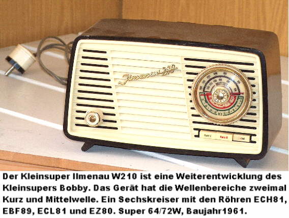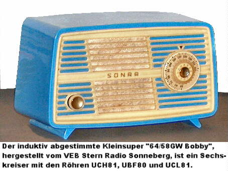 Der größte Teil der Kleinsuper in der DDR wurde vom VEB Stern Radio Sonneberg hergestellt. Dieser Betrieb, angesiedelt in der wohl berühmtesten "Spielzeugstadt", ging aus einem Verlagerungsbetrieb der AEG hervor und firmierte ab 1946 unter der Bezeichnung "EAK", Elektroapparatefabrik Köppelsdorf. Die ersten Geräte aus diesem Betrieb waren mit der RV12P2000, später mit Vorkriegsröhren der A- Reihe bestückt. Der erste "Kleinsuper" war der 64/50GWS oder GWK, ein Sechskreiser mit den Röhren UCH11, UBF11 und UCL11 bestückt. Die Typenbezeichnung der Geräte aus diesem Betrieb enthält Informationen zum Aufbau des Gerätes. Die zweite Zahl gibt die Anzahl der verbauten Röhren einschließlich des Gleichrichters an, die erste Ziffer ist die Zahl der Kreise und hinter dem Schrägstrich ist das Baujahr der ersten Geräte ausgewiesen. Allerdings wird bei der Röhrenangabe nicht zwischen Röhren- und Trockengleichrichter unterschieden. Auch ein Selengleichrichter wird als Röhre mitgezählt. Vom Schaltungskonzept her fallen die Geräte eigentlich in die Klasse der Mittelsuper. Treffender ist deshalb die Bezeichnung "Zwergsuper" für diese Radios. Am ersten Mai 1952 erfolgte die Umbenennung des Betriebes in VEB Stern Radio Sonneberg. Bereits 1951 war die Gemeinde Köppelsdorf in die Stadt Sonneberg eingemeindet worden. Daraus erklärt sich die Umbenennung des Betriebes. Der Zwergsuper 64/50 GW wurde im Holz- oder im Preßstoffgehäuse eingebaut, hat vier Kurzwellenbereiche, Mittel- und Langwelle und wird mit Maniferkernen der Firma Hescho induktiv abgestimmt. Abgelöst wurde dieses Radio 1953 durch den Schwarzburg 64/53, jetzt mit zweimal K, M und L. Auch hier wieder Holz- oder Preßstoffgehäuse. Ab 1954 wurde der Schwarzburg 875/54GU hergestellt. Die Typenbezeichnung verrät uns, daß dieses Gerät bereits UKW empfangen kann. AM- seitig hat das Gerät acht Kreise, FM ist mit sieben Kreisen ausgelegt, fünf Röhren und hinter den Schrägstrich das Baujahr, 1954. Die Konfektionierung erfolgte im Holz- oder im Preßstoffgehäuse. Fortgesetzt wurde diese Baureihe 1955 mit dem Naumburg 875/55GW. Dann folgte 1958 der Zwergsuper Bobby 64/58GW, jetzt in einer veränderten Gehäusegesteltung und mit einer Kreisskala und nur für den Empfang der Mittelwelle ausgelegt. In der gleichen Größe folgten die Kleinsuper Ilmenau 210 und Ilmenau 480, ebenfalls mit einer Kreisskala und den Wellenbreichen zweimal K und L, beziehungsweise K, M und L. Hier gibt es einen Bruch in der Typenbezeichnung. Die Zahl hinter dem Schrägstrich weist nicht mehr das Baujahr aus. Das gilt auch für Mittelsuper, wie zum Beispiel dem Erfurt 4 aus diesem Betrieb. Der 1959 gebaute Orienta 492 hat das Chassis des Ilmenau 210 in einem neuen Gehäuse. Auch der 1961 gebaute Orienta W301 basiert auf dem Chassis des Ilmenau 210.