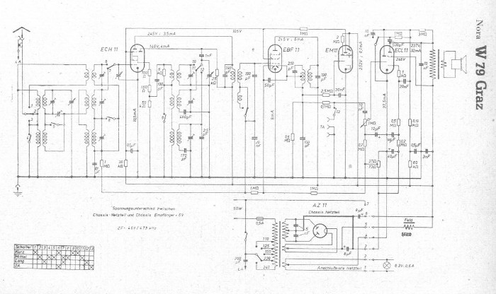 Den Schaltplan habe ich gerade leider nicht hier, wo ich z.Z. bin, kann ihn aber Anfang nächster Woche mal einstellen. Nach Deiner schönen Tabelle müsste der DeTeWe 975W ein 1P1M (3-fach Drehko) sein (ECH11, EBF11, ECL11, EM11 - AZ11), wenn ich das richtig sehe. Dieses Gerät hatte zusätzlich einen 3xum (1-Masse-1)-Tonfarbenschalter, einen LS mit Erregerspule und ist im Chassis baugleich mit dem NORA W79.