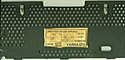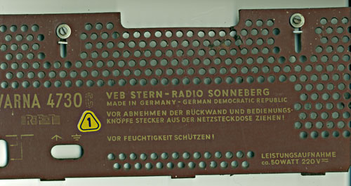 der Varna 473 wurde ca. von 1961 – 63 von Sten Radio Sonneberg gebaut. Gesehen hab ich den 473 als Plasikausführung in verschiedenen Farben, den 4730 als Gerät mit Holzgehäuse. Schaltungstechnisch gibt es keinen unterschied. Ich habe mal schnell die Rückwand von beiden Seiten eingescannt. Auf der Innenseite klebt ein Zettel mit der Bezeichnung Varna 473. Rechts daneben ist die nachträglich gestempelte Null zu erkennen. Am Chassis meines Gerätes klebt ein kleiner Zettel mit der Bezeichnung 4730. Vielleicht ist er an deinem Radio nicht mehr vorhanden, wie so oft. Die Rückwand wird mit zwei s- förmig gebogenen Winkelchen hinter der oberen Holzstrebe fixiert. Deshalb sieht man auch keine Schraublöcher. (Zu erkennen auf dem inneren Rückwandbild.) Sollten die Rückwände beider Geräte identisch sein, könnte es gut möglich sein, das einfach die vom 473 genommen wurde. Ich hab viele Sonneberg Radios gesehen, welche fabrikmäßig mit unterschiedlichen Knöpfen geliefert wurden. Bei meinem Exemplar ist das Holzgehäuse beschädigt, ein Fall für lange Winterabende. Ich wünsche Dir viel Erfolg bei der Instandsetzung dieses knuffigen kleinen Radios.