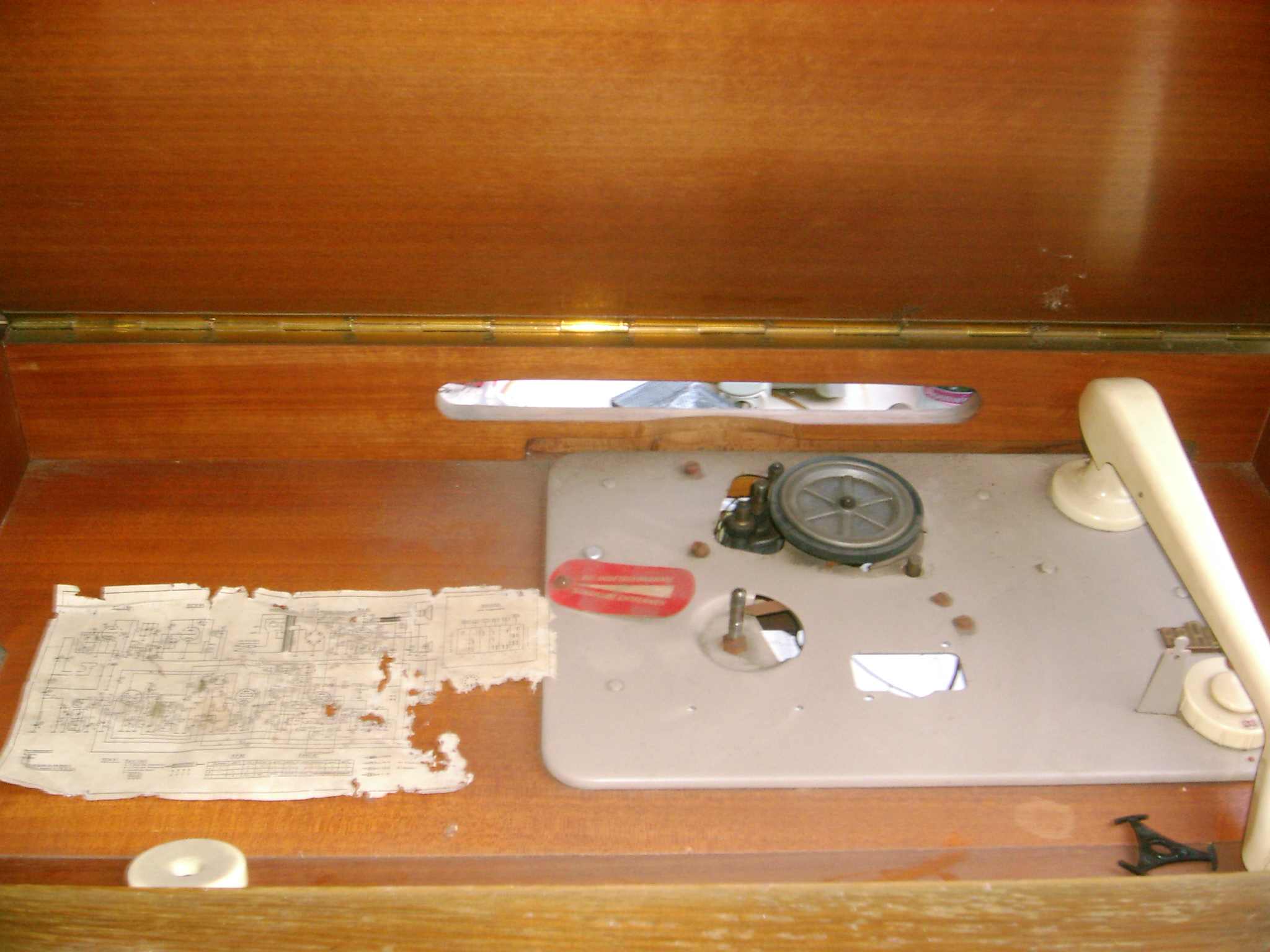 Hallo Köttel lagen aber keine drinn. Der Plattenspieler läuft wieder. KC60 rein, bischen bewegen und Strom war wieder da. Ist leider nur eine Schellacknadel drauf. Vieleicht kann mir ja einer sagen was da für ein Plattenspieler drinn ist damit ich mir noch eine für Singles besorgen kann. Einer der beiden Gummiriemen ist beim testen gerissen, oder besser gesgt gebrochen weil er Steinhart war. Da damit aber nur die Röllchen für's Reibrad angetrieben werden kann ich die aus Fahradschlauch selber machen. Glück gehabt. Mit dem Gehäuse sieht es nicht ganz so gut aus. Innen ist das Radio in einem besseren Zustand wie außen. Beschädigt ist nichts, nur der Lack ist im warsten Sinne des Wortes ab. Gottseidank hat das Funier nicht abbekommen, und alle Leisten sind auch da und noch heil. Zuerst wollte ich das Chassie heut Nachmittag noch ausbauen, aber das was ich biher gesehen hab macht;s noch nicht notwendig. Ich hatte das Gerät auf der Terasse stehen und habs dann mal nach dem der Plattenspieler etwas Nähmaschienenöl bekommen hat so 2 bis 3 Stunden laufen lassen. Der Plattenspieler läuft jetzt wieder "Geräuschlos" und sonnst sah es auch ganz gut aus. Mir ist nur im dunkeln als ich es rein geholt hab aufgefallen des eine Röhre nicht ganz OK zu sein scheint. Wenn ich richtig gesehen hab wurde die nur geheizt. Das war eine EF89. Ich glaub das ich da noch eine in meiner Röhrenkiste hab. Frage, für was wird die gebraucht. Ich hoffe ja für den Radioteil. Ich werd sie morgen mal tauschen und mal sehen was dann passiert. Auch wenn der Radioteil im moment noch nicht geht und ich noch viel Arbeit am Gehäuse hab. Ich find's klasse das Teil.