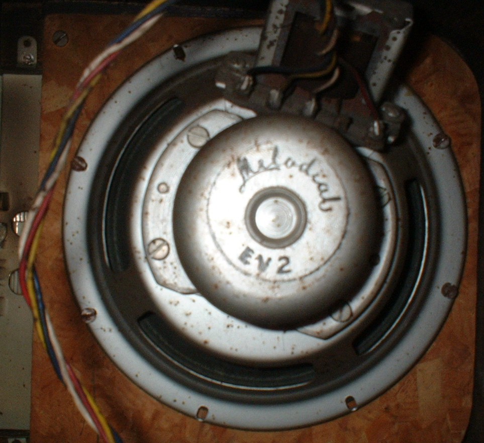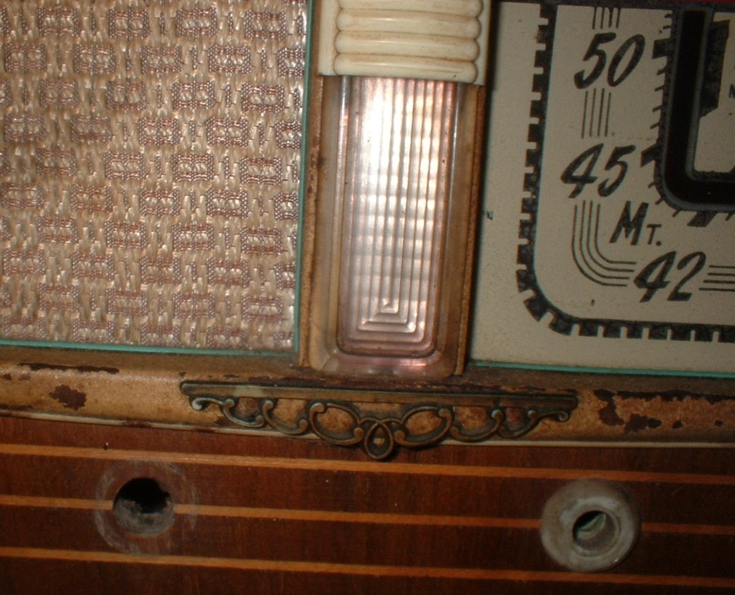 auf dem Lautsprecherstoff ist ebenfalls ein Herstellermarkenzeichen aus Blech angebracht: Mercury Radio. Deshalb tippe ich auch nicht auf ein Bastelmodell. Die 125 Voltios deuten auch eher auf Amerika hin, kennt sich jemand mit dem spanischen oder portugisieschen Stromnetz vor dem 2. Weltkrieg aus? Das Gerät wurde nicht auf Wechselstrom umgebaut, das scheint original zu sein. Bisher habe ich noch keinen Hinweis auf irgendein Herstellungsdatum (die Röhren einmal ausgenommen, da sie offensichtlich nicht original sind) gefunden. Zur Verwendung trägt vielleicht bei, daß die Gleichrichterröhre EZ81 von EEL ist, woher stammt dieses Label? Der LS ist mit Melodial beschriftet. Neubauten sind die befestigungen der Skalenscheibe und das Brett mit dem LS, diese werde ich noch entfernen, um den originalen Ausschnitt zu sehen. Auf der Skalenscheibe gibt es nur die Wellenbereiche Normal (oben) und Corta (unten)=MW+KW. oberhalb der Bedienungsknöpfe ist nur ein Zieremblem angebracht. Die Beleuchtung der Kunststoffmittelteile ist oben rot, unten weiß. das könnte aber auch falsch sein, da eine der beiden Beleuchtungslampen oberhalb der Glasskala ebenfalls rot ist, dies also vermutlich ebenfalls der beleuchtung der Mittelfelder diente.