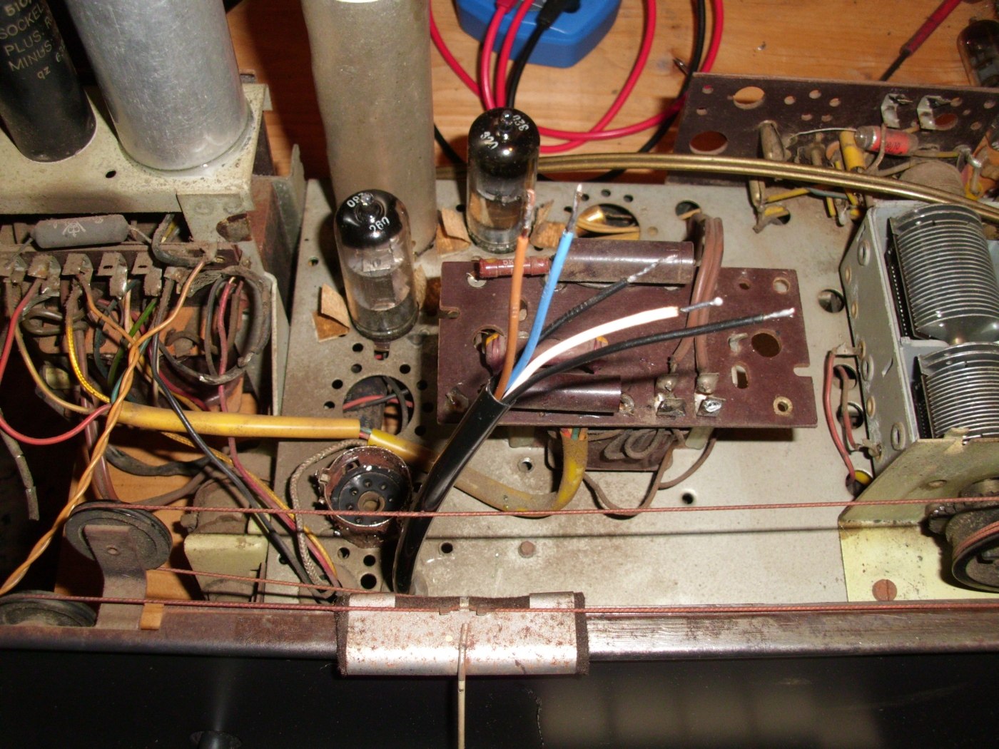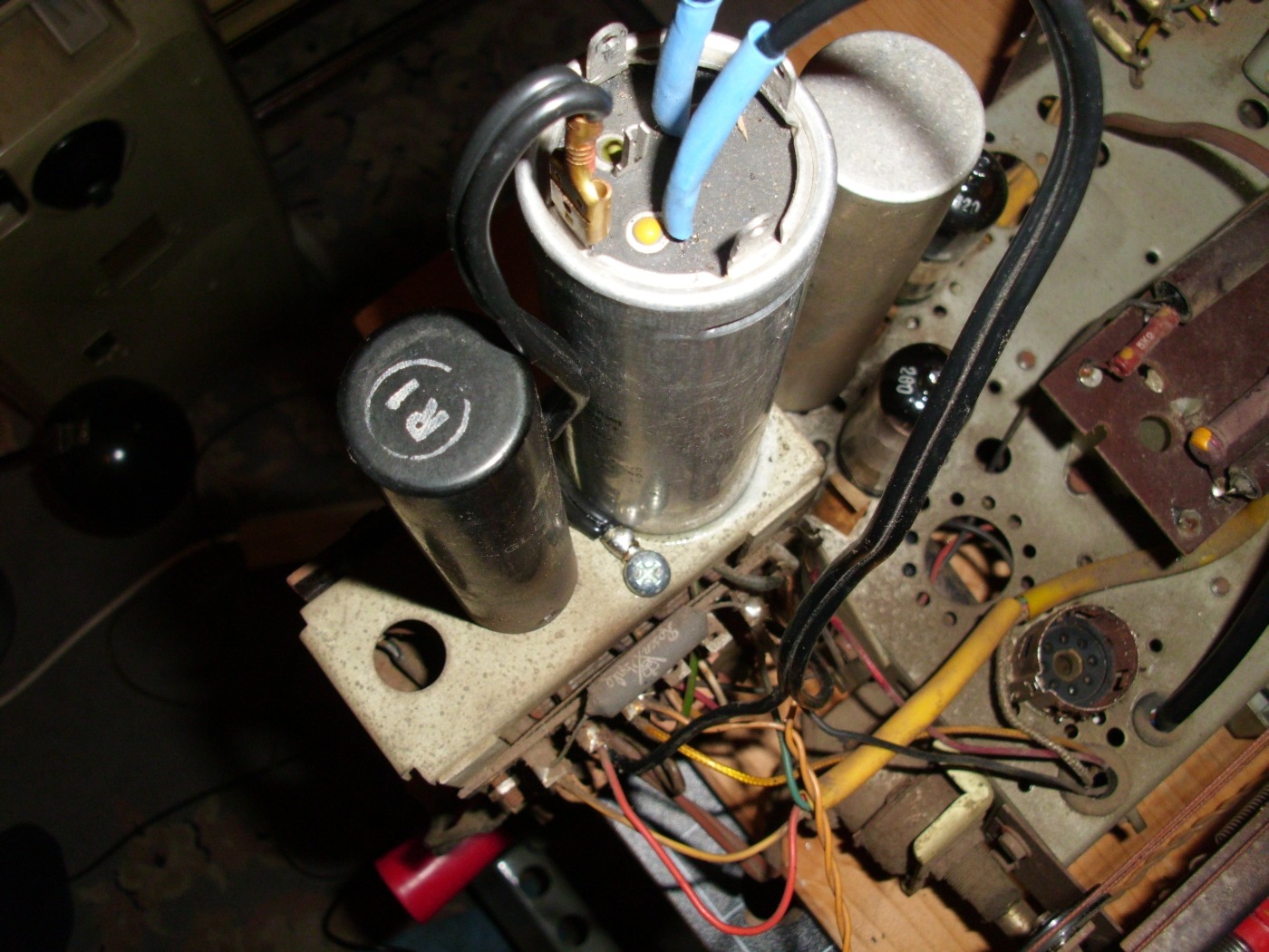 Ich hab mich gestern und heute etwas mit dem Nordmende beschäftigt. Nachdem das Chassie aus dem Gehäuse war hab ich noch etwas gefunden das wohl nicht mehr so gut war, die Leitung zum Auge. Sie lag an einer Röhre und sah angekokelt aus. Einen Kondensator mit den Originalwerten hab ich leider nicht bekommen. Der den ich jetzt drinn hab hat nicht zweimal sondern dreimal 50 Mikrofarad. der rest der Werte stimmt Ich hab ihn da nicht zum schrauben etwas Unkonventionell befestigt, aber ich denke mal das es so geht. Die Leitung zum Auge hab ich auch ersetzt und noch alles gereinigt und das Blech hinter der Scalenscheibe neu Lackiert.