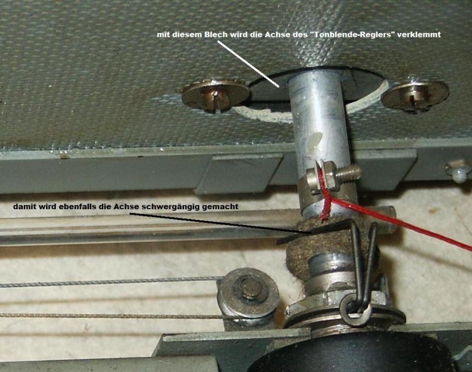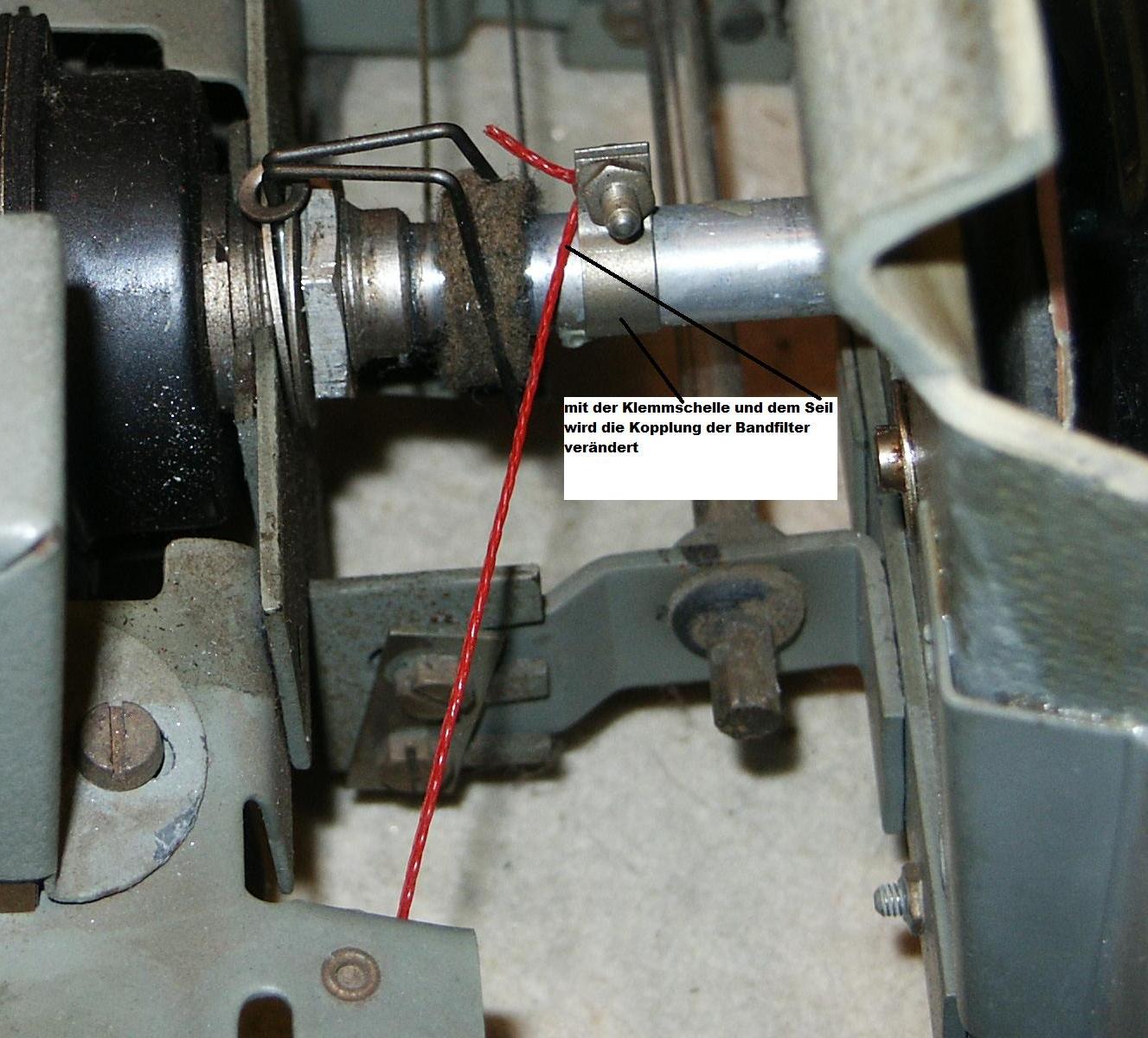 1. In diesem Gerät kann die Kopplung der Bandfilter (AM-Bereiche) und damit die Bandbreite der ZF verändert werden. Das geschieht durch einen Seilzug, der mit der Achse des „Tonblende-Reglers“ verbunden ist. Angezeigt wird die Stellung durch eine markierte Scheibe, die auf die Achse des Reglers aufgesteckt und durch ein Fenster in der Skalenscheibe sichtbar ist. Den Ist-Zustand der „Reglung“ habe ich in den beigefügten Bildern dokumentiert. Wobei ich mir ziemlich sicher bin, dass das nicht der Originalzustand ist: a. Die aufgesteckte Scheibe, die farblich bestimmt anders markiert war (eingeteilt in Sektoren?). b. Die Art, wie das Antriebsseil fixiert und geführt(aufgewickelt) wird c. Wie die Poti-Achse schwergängig gemacht wird, um die Kraft der Rückzugfeder zu kompensieren
