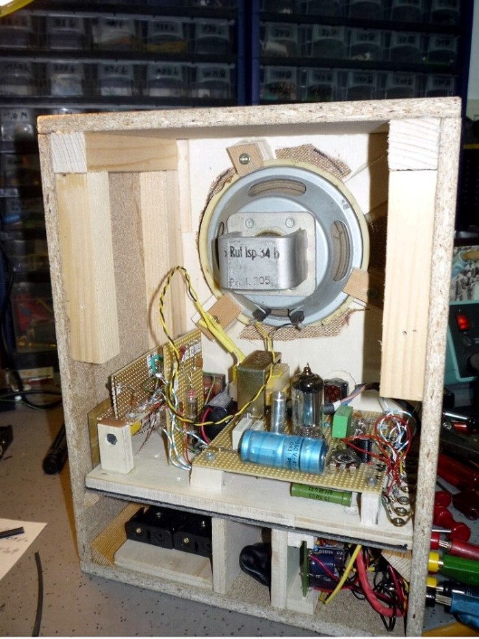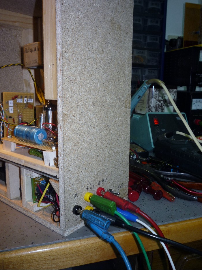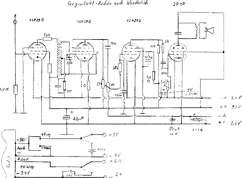 Hallo zusammen, das Audion frei nach " Wunderlich " (das war der mit den Blauen Röhren) ist jetzt fertig und funktioniert in meinem Keller ungef. wie ein VE. Obwohl es keine Rückkopplung kennt, empfängt es mit einer Meßstrippe als Antenne tagsüber meine 2 Standard Stationen, abends mehr. Es ist auf eine 9 und 2,4 V Spannungsversorgung ausgelegt, die extern von einen Netzteil oder für Vorführzwecke auch intern aus Accus gewonnen wird. Die Accus halten jedoch nicht lange, da der Wandler welcher die 90 V Anodenspannung erzeugt doch um die 100 mA zieht; aber zum Vorführen langt es. Nach langem Experimentieren erzeuge ich jetzt die Gittervorspannung mit einer Gitterbatterie. Damit ist das Projekt, eine Wunderlich Schaltung mit 1SH37B nach zu empfinden für mich abgeschlossen. Ich danke allen, die mir geraten haben. Grüsse Franz