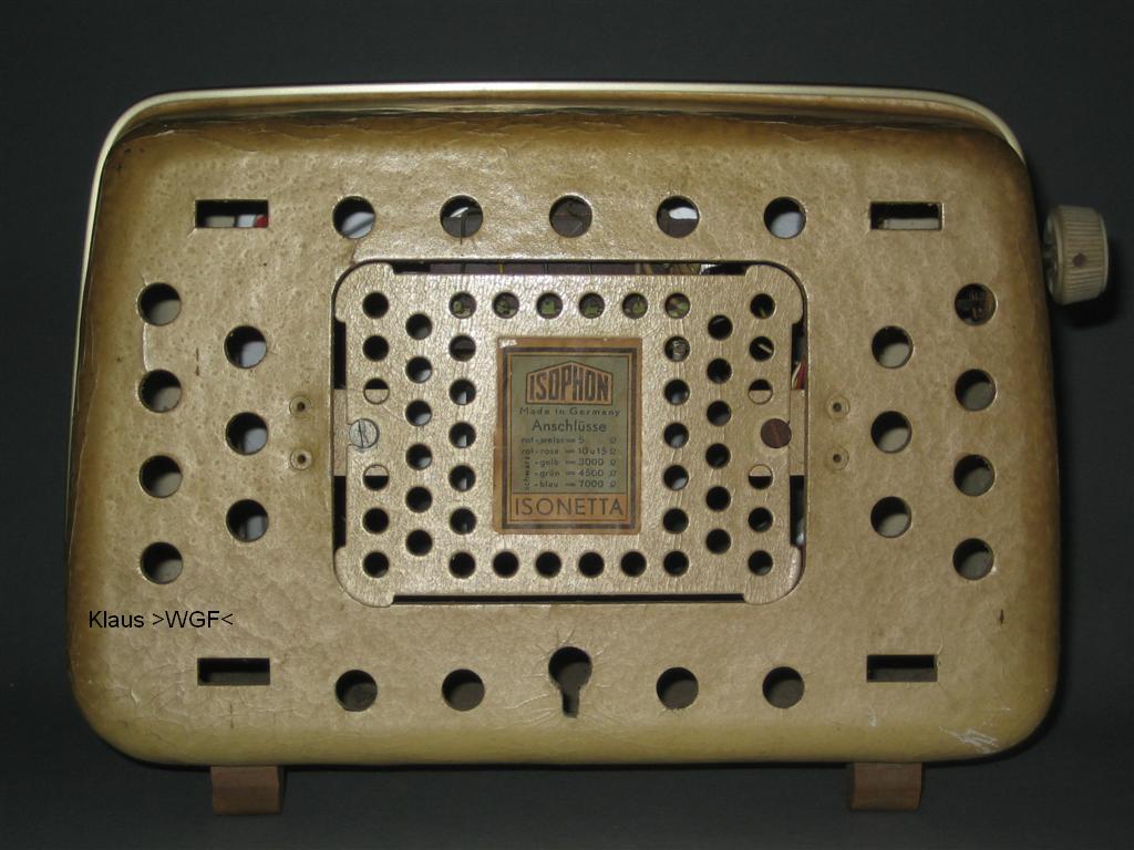 passend zu diesem Thread möchte ich euch einen alten ISOPHON-Zusatzlautsprecher Isonetta zeigen, den ich vor vielen Jahren erhielt. Wie bereits geschrieben, handelt es sich um einen sogen. Breitbandlautsprecher in ovaler Bauform, der in einem akustisch offenen Gehäuse aus Hartpappe untergebracht ist. Da früher viele dieser Lautsprecher als Zusatzgeräte für weitere Räume (z.B. Küche) vorgesehen waren, wurde er mit einem Lautstärkeregler (Drahtpoti) versehen, um individuell die gewünschte Lautstärke unabhängig vom Radio reduzieren zu können. Ferner verfügt der Lautsprecher über einen eingebauten Trafo, um ihn an verschiedene Ausgangsimpedanzen (5, 10, 15, 3000, 4500, 7000Ohm) anschließen zu können.