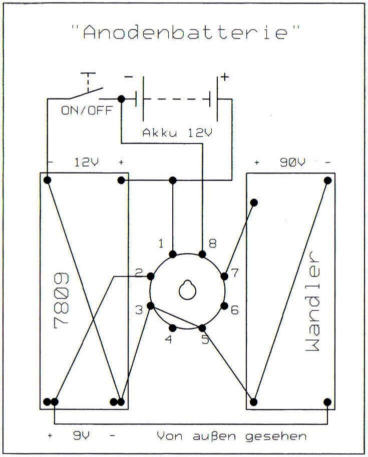 Aus einem 12Volt-Bleiakku erzeuge ich zuerst mit einem 7809 die zur Heizung notwendigen 9Volt. Diese gehen gleichzeitig auf den kleinen Wandler, der dann die 90Volt-Anodenspannung liefert.