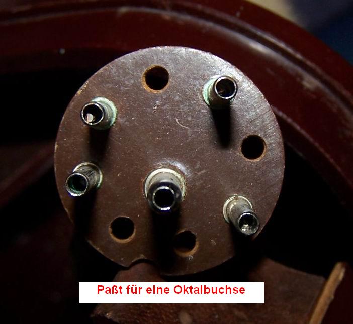 Die Batterieanschlußbuchse konnte aus einer Oktalfassung gewonnen werden, denn die Anschlüsse des Radiosteckers passen hier genau hinein. Zwei weitere Anschlüsse der Fassung habe ich zur Akkuladung genutzt.