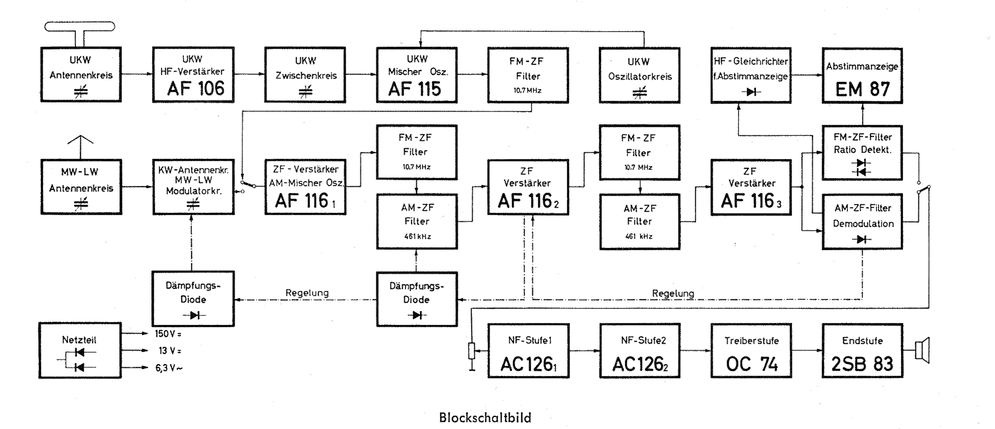 Der Transistor hielt nach Mitte der sechziger Jahre Einzug in den Heimempfängern und löste die Röhre ab. Nur wenige Hersteller bauten schon Anfang der sechziger Jahre voll transistorbestückte Empfänger. Das Blockschaltbild zeigt einen Empfänger, der nur noch eine Röhre EM87 als Abstimmungsanzeige hat. Damit läßt das äußere Erscheinungsbild des Gerätes ein klassisches Röhrenradio vermuten. Einzig die sofortige Betriebsbereitschaft des Gerätes nach dem Einschalten spricht gegen einen Röhrenempfänger.