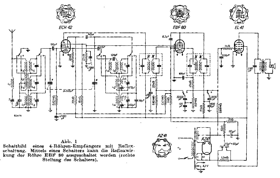 Es fehlt im Scan die Vorstufe. Das ist die einzige Schaltung die neben der echten Audion - Gittergleichrichtung auch eine extra Diode, die aus der HF Energie des Audion eine Regelspannung erzeugt die ich gesehen habe. Die Sache mit der EAM 86 fiel mir eben so ein, allerdings wäre bei MW zu berücksichtigen das der Blindwiderstand bei fast 1,2 MHz Fu ^ Fo auch nicht konstant ist, und somit höhere Frequenzen eine größere ALR erzeugen, man müsste eine Induktivität zum Ausgleich in Reihe schalten.