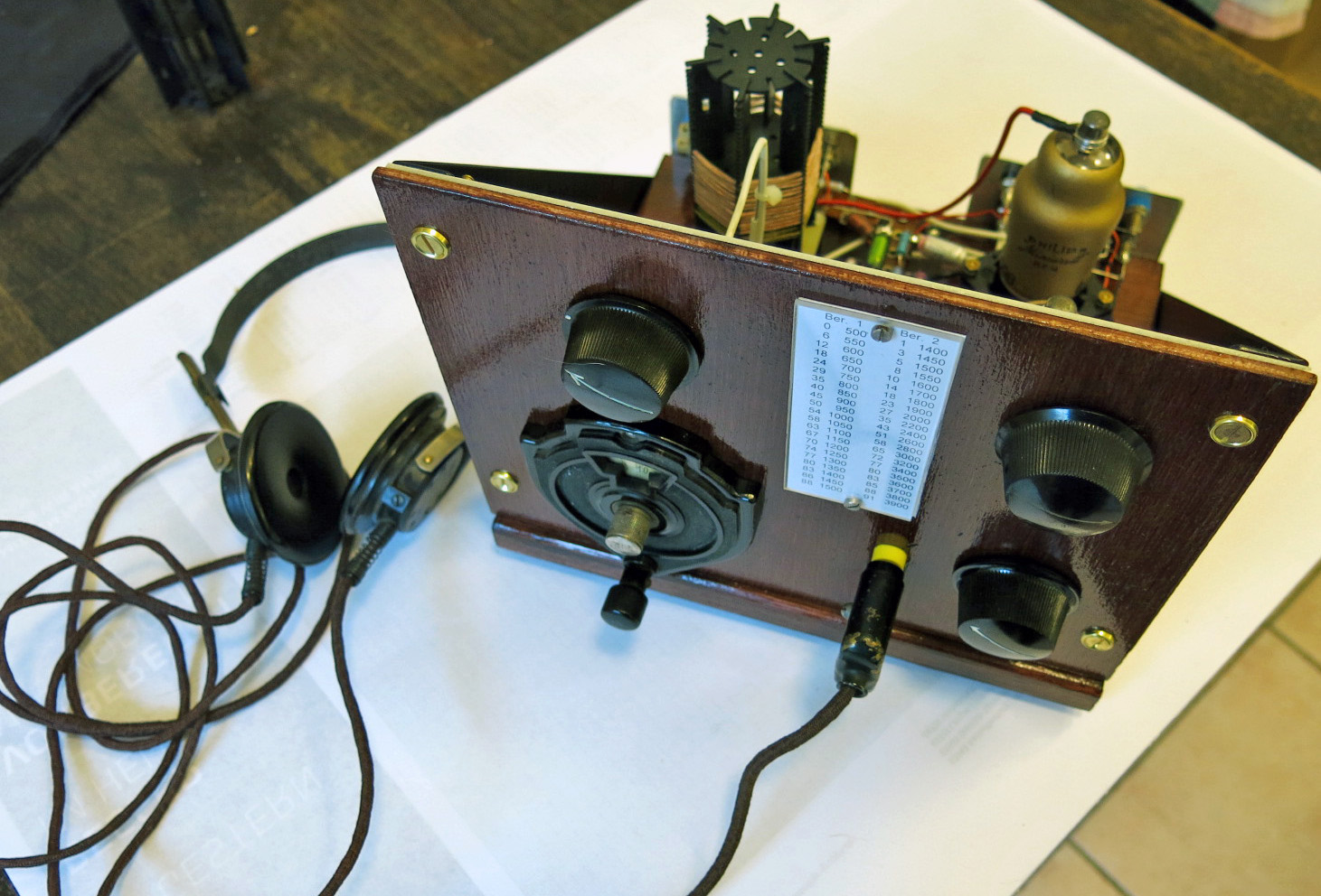 Wenn ich die Röhre rausnehme, kann ich zwischen Anodenanschluss und vor der Gitterkombination einen Detektor anschliessen. Allerdings kommt tagsüber nur noch Wawre 621 kHz mit 55 dBµV (=75 dBµV/m) an. Im Detektor ist dieser Sender gerade noch aufzunehmen.