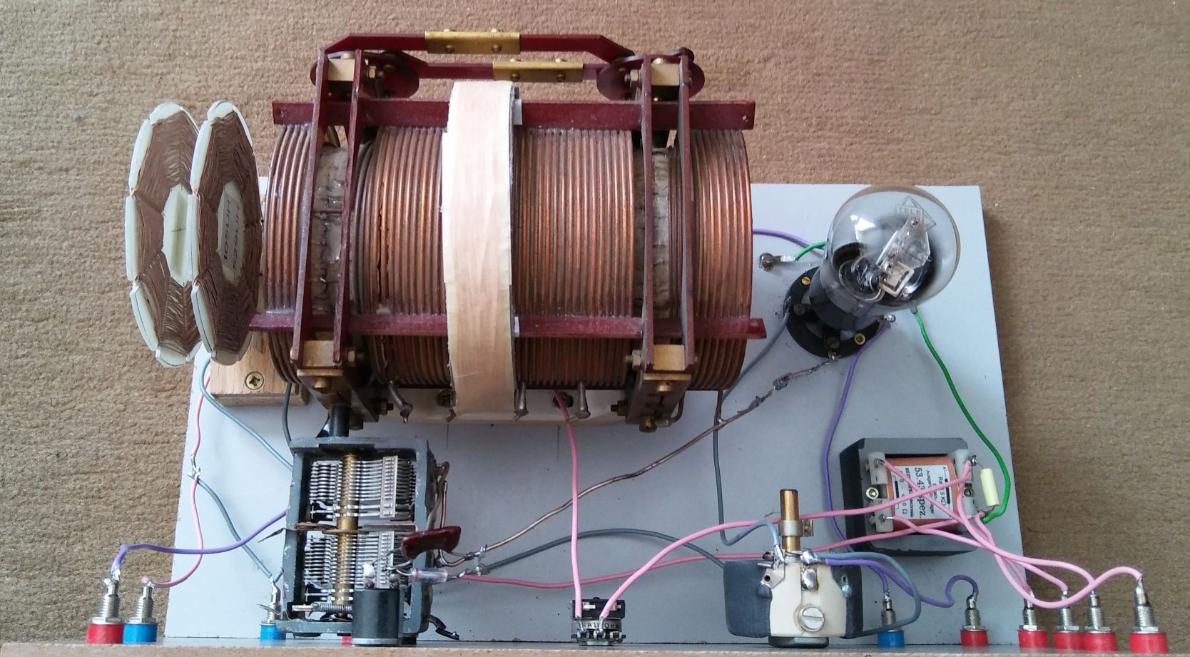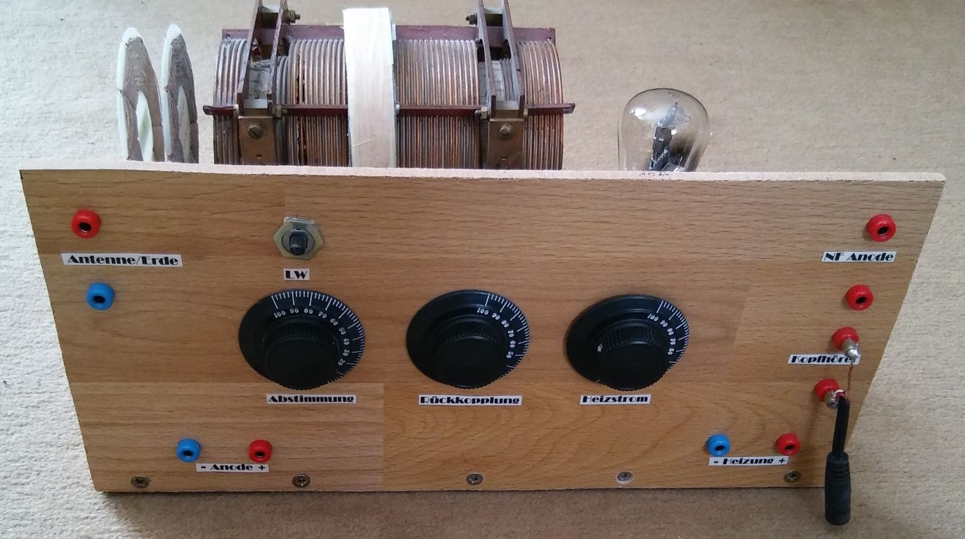 dank der Aussenantenne komme ich mit weniger Aufwand und einer Röhre (z.Zt. KC1) aus. Der Empfang lässt auf MW keine Wünsche offen. Allerdings ist die Selektivität nicht optimal, weil die ursprüngliche Antennen-Koppelspule links momentan mit der Kreisinduktivität in Serie geschaltet ist. Auch die LW-Umschaltung ist wegen ungünstigem L/C-Verhältnis und zu kleiner Rückkopplungsspule nicht optimal. Mein Detektor bringt auf LW mehr Lautstärke!.