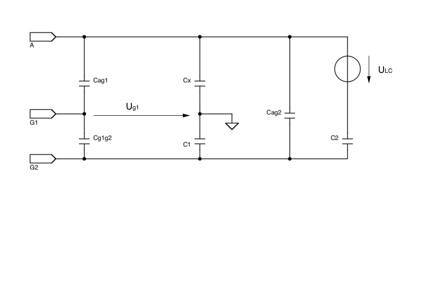 Die Anschlüsse links sind die Anode (A), das Steuergitter (G1) und das Schirmgitter (G2) der Röhre. Die Kondensatoren C1 und C2 entsprechen dem obigen Schaltbild, Cag1 ist die Kapazität zwischen Anode und Steuergitter, Cg1g2 die Kapazität zwischen Steuer- und Schirmgitter und Cag2 die Kapazität zwischen Anode und Schirmgitter. Cx ist wie erwähnt die (parasitäre) Kapazität der Anode nach Masse. Das Bandfilter wird hier als Spannungsquelle ULC modelliert. Weiter wird angenommen, dass der Blindwiderstand von C1 und C2 viel kleiner ist als die Widerstandswerte von R1 und R2, so dass man die Widerstände als nicht existent betrachten kann. In der Praxis ist das immer der Fall, da sonst der Zweck (Entkopplung) nicht erfüllt wird. Die Funktion ist nun folgende: Rückwirkungsfreiheit ist dann gegeben, wenn keine Spannung von der Anode auf das Steuergitter (G1) eingespeist wird, also die Spannung Ug1 Null wird. Da die (röhreninterne) Koppelkapazität Cag1 'gottgegeben' ist, bedeutet das, dass man eine weitere, gegenüber der Anodenspannung um 180° gedrehte Spannung auf das Steuergitter einspeisen muss. Bei Trioden ist das ja bekannt und erfolgt durch eine externe Schaltung. Bei Pentoden bietet sich für diesen Zweck das Schirmgitter an. Somit braucht es also am Schirmgitter eine gegenüber der Anode um 180° gedrehte Spannung, und das Verhältnis Anoden- zu Schirmgitterspannung muss dem Verhältnis Cag1 zu Cg1g2 entsprechen. Wenn man jetzt davon ausgeht, dass alle von der Anode nach Masse führenden Kapazitäten in Cx vereinigt sind, entspricht das Verhältnis Anoden- zu Schirmgitterspannung dem Kapazitätsverhältnis Cx/C1. Somit hängt also die Neutralisation von C1 und der Schaltungskapazität im Anodenkreis ab. Typische Werte von Cag1/Cg1g2 sind so um 1/500. Nimmt man für Cx einen Wert von 10pF, ergibt sich folglich für C1 ein Wer um 5nF, was etwa der Praxis entspricht. Bei meinen Geräten habe ich Werte zwischen 3.3nF und 5.6nF gefunden.