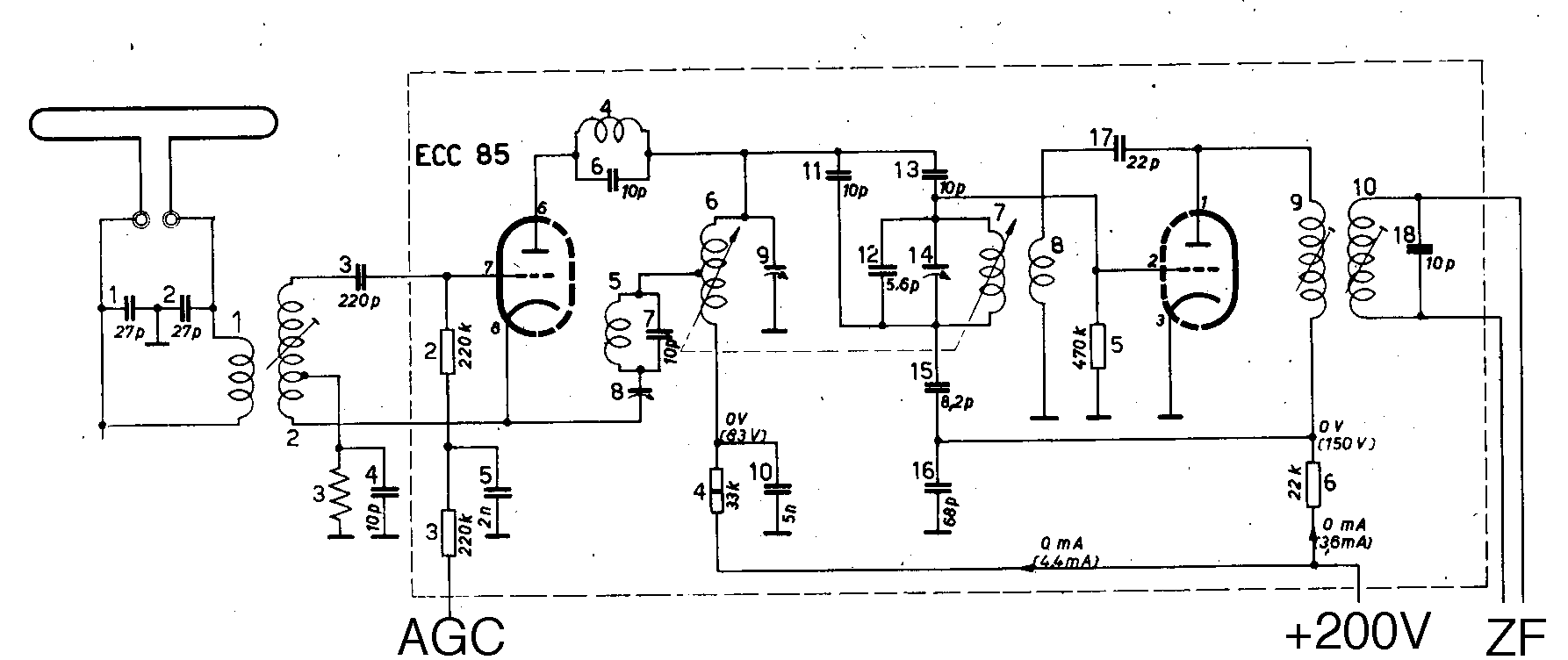 Zum Anfang die Schaltung vom Resonar 8539 mit der ECC85, die ist repräsentativ und noch überschaubar: