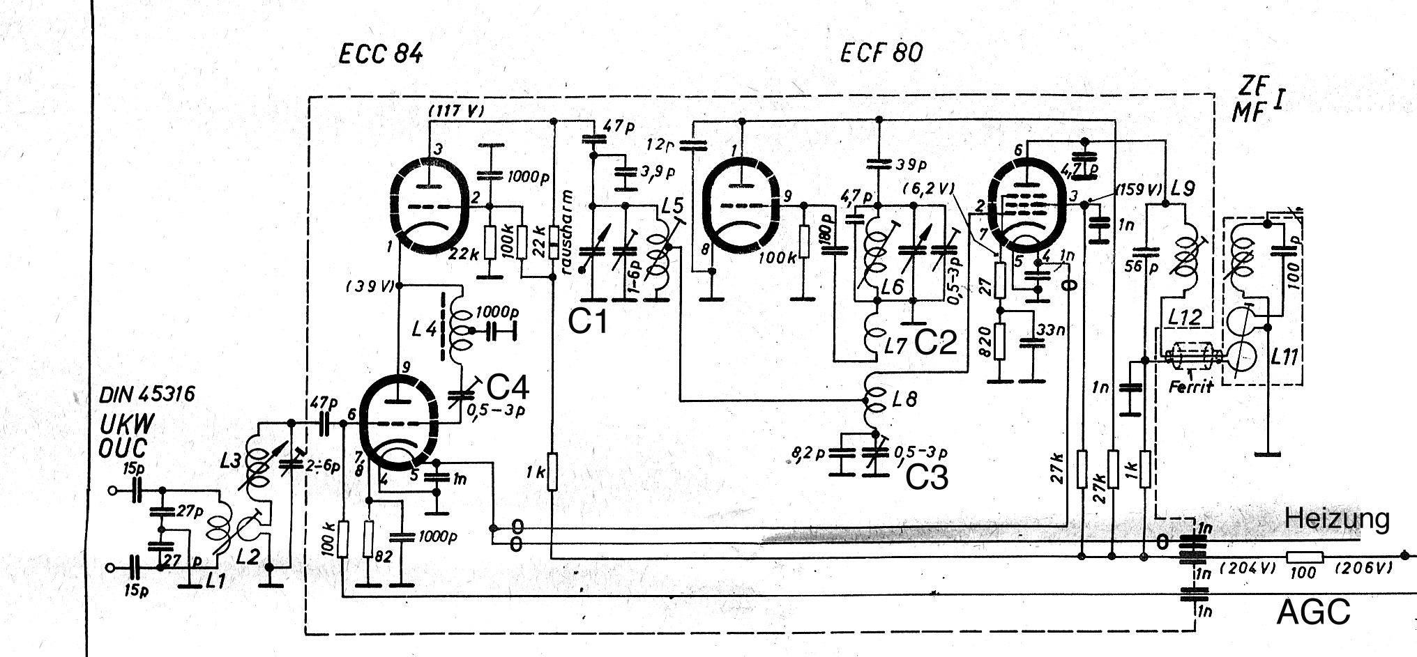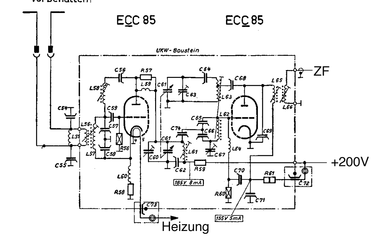 Auch hier ist die Mischröhre für die ZF neutralisiert, was mit C71 gemacht wird. Die Spule L64 zum Gitter hat für UKW eine hohe Impedanz, so dass die Neutralisation nur für die ZF wirksam wird.