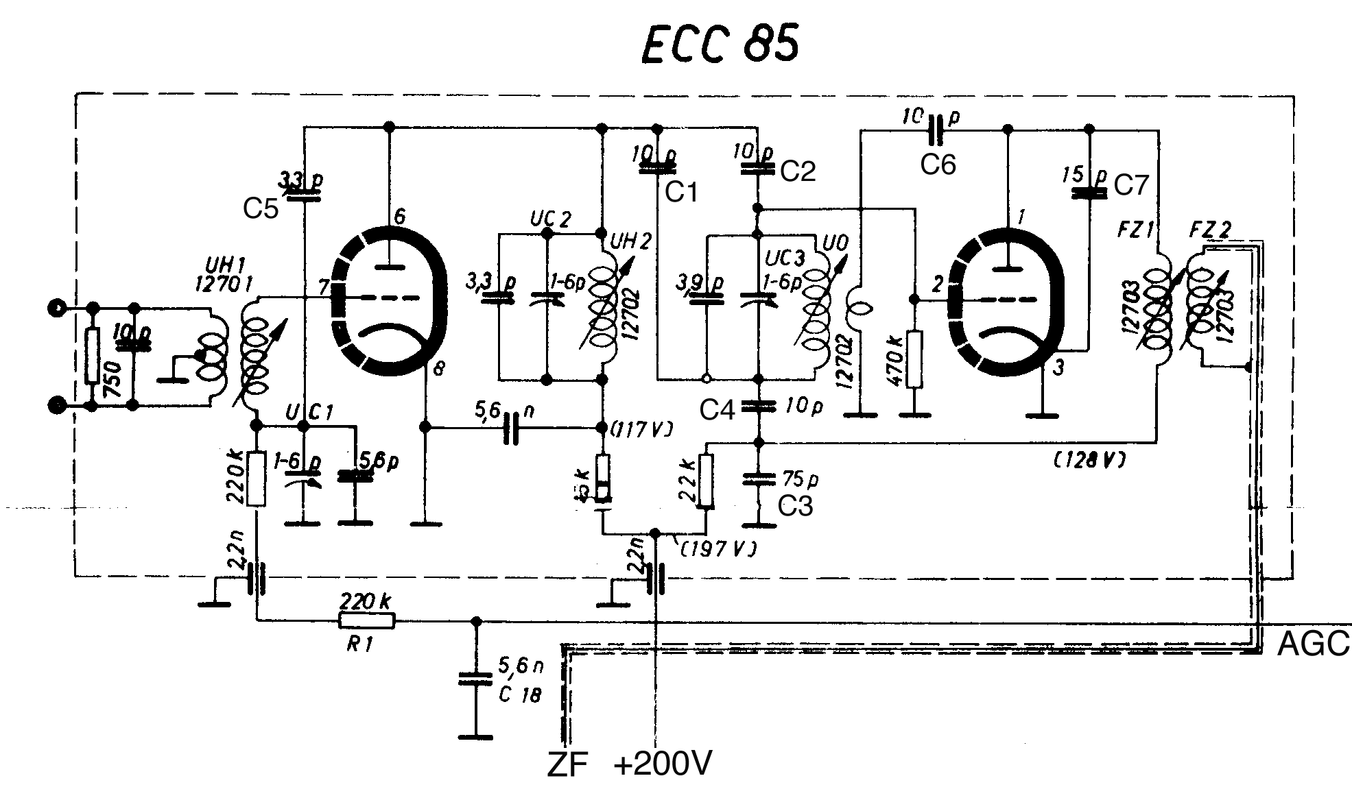 Selbstverständlich gilt dasselbe bei der Bestückung 2*EC92. Bei der ECC81 hingegen kommt als HF-Stufe nur die Gitterbasis-Schaltung in Frage, da die Anoden nicht gegeneinander abgeschirmt sind und somit die Oszillatorspannung auf die Anode der HF-Stufe und so auch auf das Gitter einkoppelt. Daher wurde sie auch nicht allzu häufig verwendet. Pentoden als HF-Stufe waren immer in Kathodenbasis geschaltet.